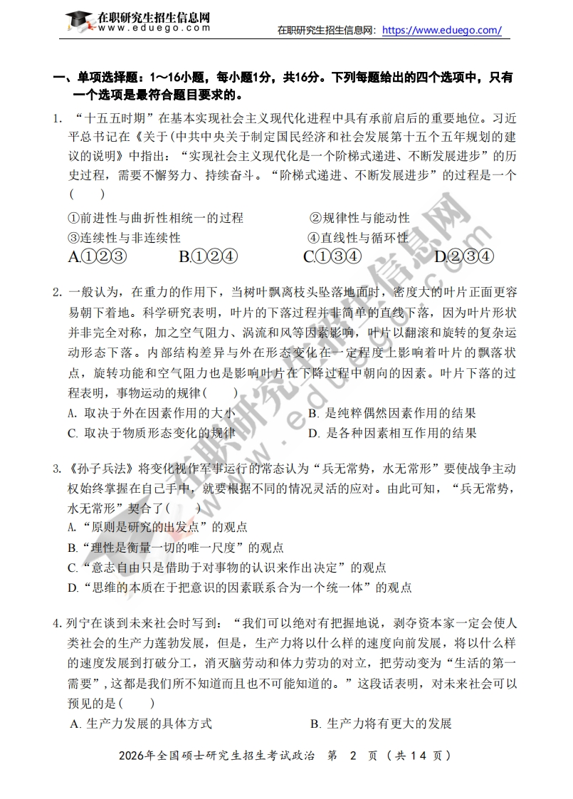 在职研究生招生信息网www.ed ue g o.c o m在职研究生招生信息网:https:/www.eduego.com/绝密★启用前2026年全国硕士研究生招生考试政治(科目代码:101)生信息网c o m考生注意事项1.答题前,考生须在试题册指定位置上填写考生编号和考生姓名:在答题卡指定位置上填写报考单位、考生姓名和考生编号,并涂写考生编号信息点。2.选择题的答案必须涂写在答题卡相应题号的选项上,非选择题的答案必须书写在答题卡指定位置的边框区域内。超出答题区域书写的答案无效;在草稿纸、试题册上答题无效。3.填(书)写部分必须使用黑色字迹签字笔书写,字迹工整、笔迹清楚:涂写部分必须使用2B铅笔填涂。下4.考试结束,将答题卡和试题册按规定交回。W(以下信息考生必须认真填写)考生编号考生姓名
