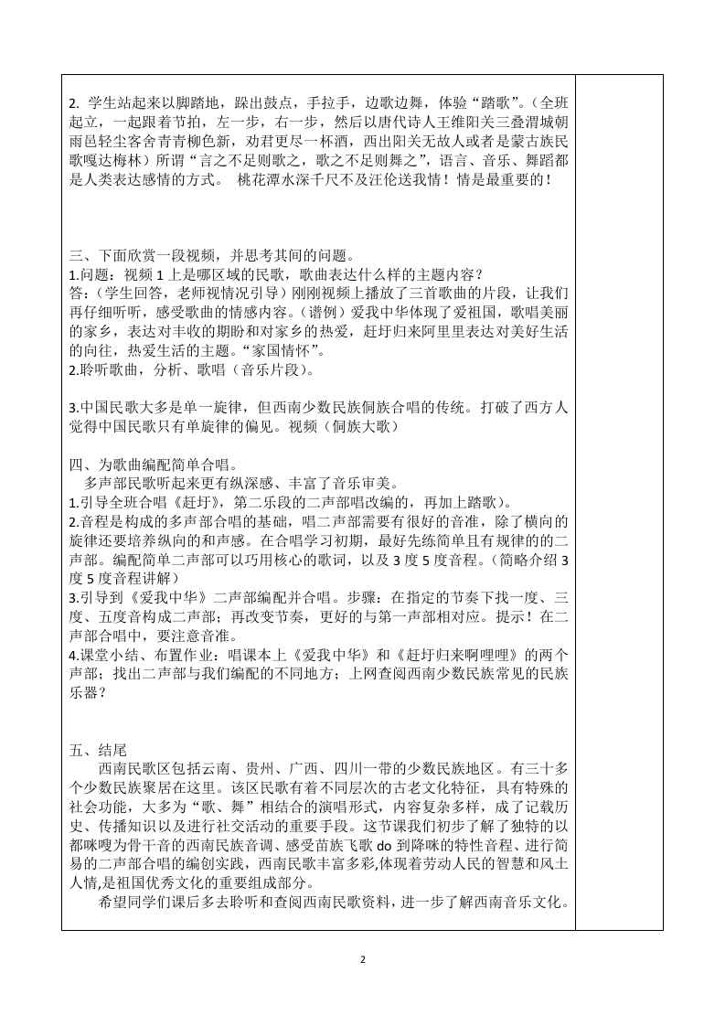 福建省厦门一中音乐学科教案单元第四单元课时第1课时授课2019.11.13课题《村寨踏歌》分总总3课时时间上午8:45-9:30学段授课备注送教课:初二8班杨宝富厦门同安实验中学班级教师说明苏少版音乐8年级教材教材1.本单元歌曲演唱模块选用以西南少数民族音调创作,表现民族团结的合唱歌曲《爱我中华》、二声部合唱曲《赶圩归来啊哩哩》,欣赏模块选用苗族飞歌《》歌唱分美丽的家乡》和器乐曲《瑶族舞曲》。本课以歌曲教学为主。2.《爱我中华》是20世纪90年代初,乔羽和徐沛东为在广西举行的第四届全国少数民族运动会开幕式创作的主题曲。此曲此歌2001年荣获中国歌曲首届金钟奖金奖。3.《歌唱美的家乡》是一首颇具代表性的苗族飞歌他音调高亢嘹亮,热情奔放结构短小节奏自由瑶瑶会的苗寨山青水秀,股米飘香的美丽景象,表达了苗族人爱家乡的情感。《赶圩归来啊哩哩》由舞蹈歌曲改编为独唱曲,先后获得广西文艺创作铜鼓奖、全国优秀歌曲奖、联合国科教文卫组织将此歌定为亚太地区的音乐教材。本教材采用了二声部合唱版。教1.喜爱我国西南少数民族民间音乐风格作品,有兴趣了解西南少数民族的音乐文化。2.欣赏歌曲,了解西南民歌的一些特点,感受歌曲的美。3.能用热烈欢快的情绪与和谐的声音歌唱《爱我中华》《赶圩归来啊哩哩》,尝试为歌曲编配简单的二声部合唱。4.以音乐作品中热爱生活、热爱家乡、热爱祖国的主题内容的来增进集体意识和合作精神。教1.“踏歌”注意拍点的准确,伴随歌唱的起伏在律动中调节步伐,抒发情感。2.对比聆听domi和do降mi,感受苗族飞歌的特点:唱《赶圩归来啊哩哩》二声部重之间要注意相互聆听,注意节奏和音高的准确。3.参照《爱我中华》旋律找3、5度音,按指定节奏编配二声部旋律。教学过程:备注一、开场:今天我们的课题是:第四单元《村寨踏歌》。请同学们说说这里的“踏歌”是什么意思?《资治通鉴·唐则天后圣历元年》:“尚书位任非轻,乃为虏蹋歌。”胡三省注:“蹋歌者,连手而歌,蹋地以为节。“踏歌”是中国传统民间舞蹈,又名跳歌。从汉唐及至宋代,都广泛流传。舞者成群结队,手拉手,以脚踏地,跺出鼓点,边歌边舞。教师示范并引导学生体验边歌边舞的“踏歌”。1.教师以《阳关三叠》为例做示范: