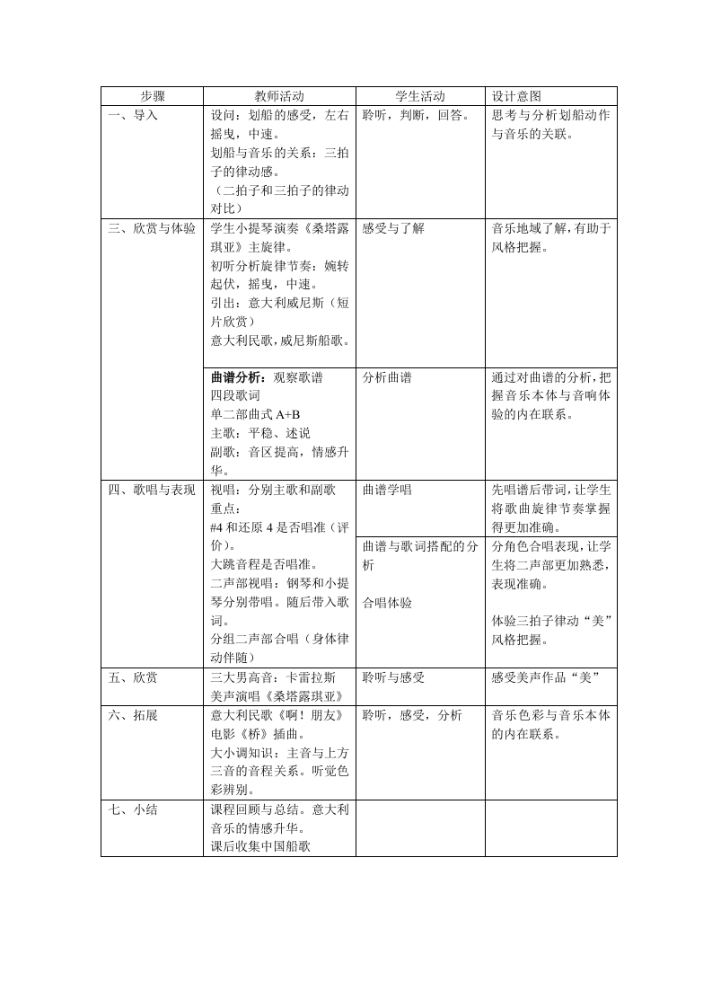省级课题公开课(校级)教案课题名称中学音乐情美乐教学多样化模式的实践研究学段学科音乐作者姓名王浩汀所在学校集美中学授课对象初二1班案例类型唱歌课八年级(上)第五单元桑塔露琪亚【教学目标】情感态度价值观:通过欣赏意大利民歌,学唱《桑塔露琪亚》,领略意大利独特的艺术魅力。激发对世界优秀音乐文化的了解和兴趣。达到“情”的熏陶。知识与能力用自然圆润的声腔合唱《桑塔露琪亚》,了解意大利船歌特点,准确表达船歌演唱风格。过程与方法通过熟练地视唱歌谱,进行二声部合唱,并表现。进行“美”的体验。【教材分析】《桑塔露琪亚》为意大利民歌中的“船歌”。描绘夏夜荡舟海面的情景。C大调,八三拍,单二部曲式。全曲摇曳悠扬,婉转起伏。A部平稳述说,B部音区提高,情绪升华。【学情分析】初二年级学生正处于心理特征转折点,所学歌曲既要有一定的内涵深度,亦要有美感,好听。《桑塔露琪亚》是听觉上很美的一首西方民歌。中等速度,悠扬曲调,较易学唱,容易感知。易被学生接受与实践。【教学资源与工具设计】钢琴、多媒体设备、板书【教学重点、难点】重点:理解意大利民歌中船歌的风格特点,演唱状态的把握。难点:用圆润、连贯的声音歌唱,合唱双声部的准确演绎。【教学方法】启发式教学、听唱法、模唱法。【教学用具】多媒体设备、钢琴、板书【教学过程】
