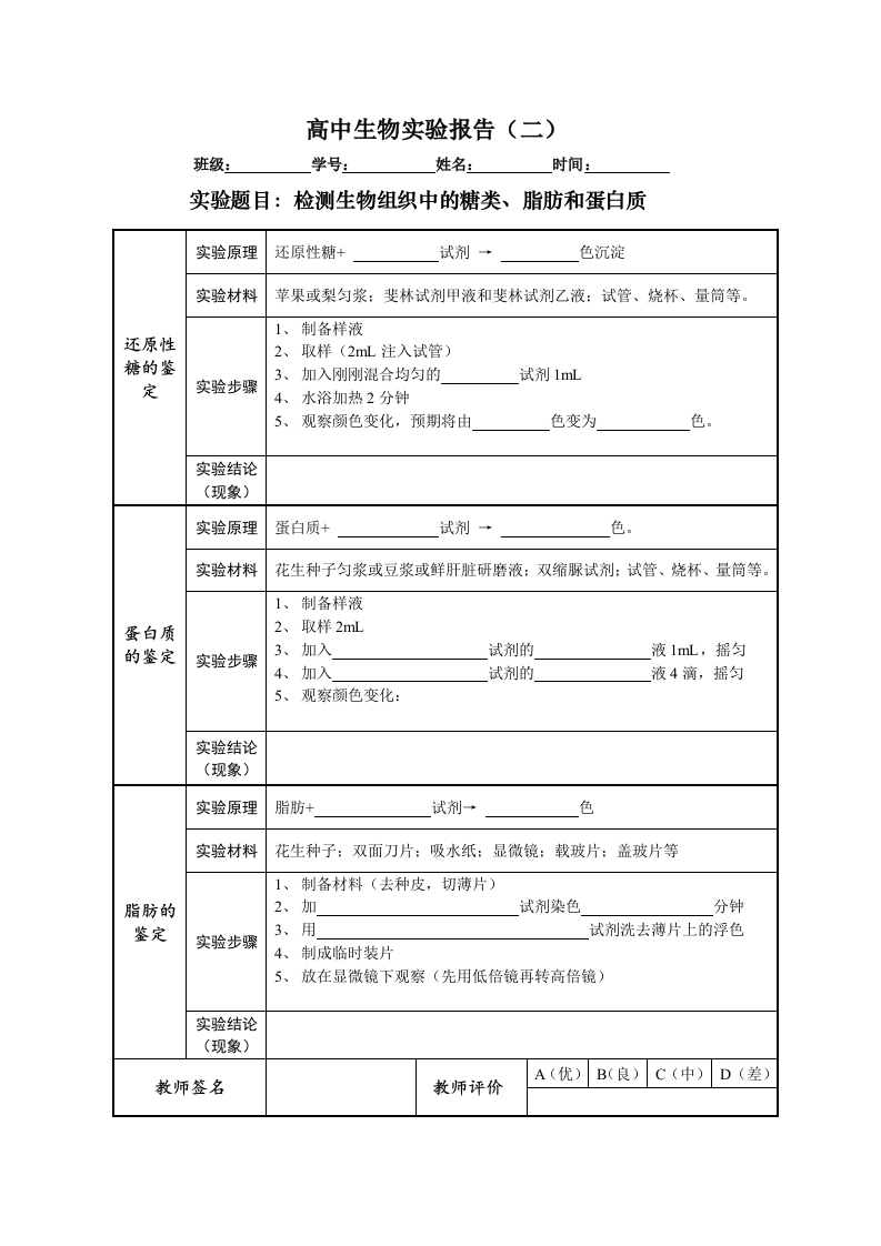 高中生物实验报告(一)班级:座号:姓名:实验题目用显微镜观察多种多样的细胞1.初步掌握高倍显微镜的使用方法实验目的2.学习制作临时装片的方法3.使用高倍显微镜观察几种细胞,比较不同细胞的异同点酵母菌细胞、绿藻细胞、叶的保卫细胞、鱼的红细胞、显微镜、载玻片、盖实验器材玻片、镊子、滴管、清水。先用倍镜观察清楚→移动玻片,使观察目标移到→转动以换用高倍镜观察→若此时视野较暗,可以调节或最后,调节准焦螺旋,使图像清晰。物镜越长,放大倍数越目镜越长,放大倍数越目镜(无螺纹)物镜(有螺纹)实验步骤物像大小细胞数目视野亮度物镜与玻片视野范围的距离高倍镜小低倍镜大显微镜下可见细胞形态多样,这体现细胞的特点:同时也可见细胞都有相似的基本结构,如:等,这实验结论体现细胞的特点。A(优)B(良)C(中)D(差)教师签名教师评价