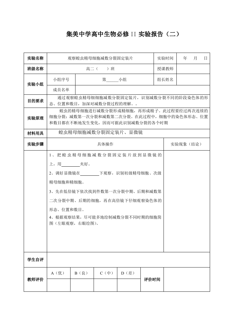 集美中学高中生物选修II实验报告(一)实验名称性状分离比的模拟实验时间年月日班级名称高二()班授课教师小组序号第小组组长姓名实验小组成员名单通过模拟实验认识和理解“基因的分离和随机结合”与“生物性状”之间的数量关系,目的要求为进一步学习基因分离定律的实质打下一定的基础。由于进行有性杂交的亲本,在形成配子时等位基因会发生分离:受精时,雌雄配子又会实验原理随机结合成合子。因此,杂合子杂交后发育成的个体,一定会发生性状分离。本实验就是通过模拟唯雄配子随机结合的过程,来探讨杂种后代性状的分离比材料用具小塑料桶2个,2种色彩的小球各20个。实验步骤具体操作实验现象(结论)1.分别摇动甲、乙小桶,使桶内小球充分混合。2.分别从两个桶内随机抓取一个小球,这表示让雌配子与雄配子随机结合成合子。每次抓取后,记录下这两个小球的字母组合。3.将抓取的小球放回原来的小桶,按上述方法重复做50~100次(重复的次数越多,结果越准确)。4.统计小球组合分别为DD、Dd和dd的数量,并将统计结果填写在《实验报告册》上。5.计算小球组合DD、Dd和dd之间的数量比,以及含有小球D的组合与dd组合之间的数量比,并将计算结果填写在实验结论上。学生自评A(优)B(良)C(中)D(差)教师评价评价时间
