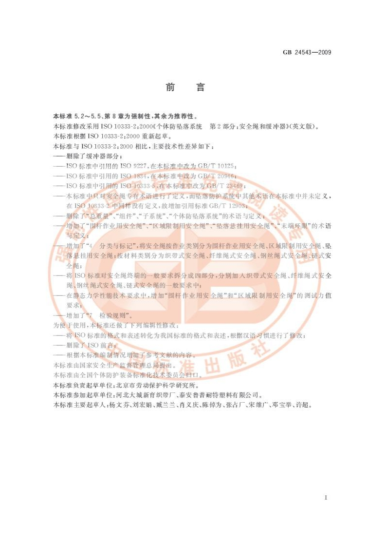 Cs13.340.99C73GB中华人民共和国国家标相GB24543-2009坠落防护安全绳Personal fall protection equipment-Lanyards(ISO 10333-2:2000 Personal fall-arrest systemsPart 2:Lanyards and energy absorbers.MOD)2009-10-30发布2010-09-01实施中华人民共和国国家质量监督检验检疫总局中国国家标准化管理委员会发布