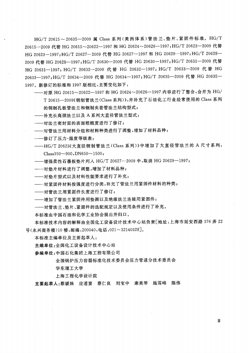 前言本系列标准根据国家发展和改革委员会(发改办工业[2007]1415号文)和中国石油和化学工业协会(中石化协科发[2007]144号文)的要求,由中国石油和化工勒察设计协会组织全国化工设备设计技术中心站编制。本系列标准自实施之日起代替HG20592~20635一1997《钢制管法兰、垫片、紧固件》。本系列标准是对HG20592~20635一1997《钢制管法兰、垫片、紧固件》系列标准的修订。本系列标准主要参照EN1092-1:2002《法兰及其连接件管道、阀门、管件和附件用圆盘法兰,PN标识一第1篇:钢制法兰》、ASME B16.5一2003《管法兰和法兰管件》等国外先进标准,并结合国内实际情况修订而成,包括了国际通用的两大管法兰、垫片和紧固件标准系列:PN系列(欧洲体系)和Class系列(美洲体系)。HG/T20592~20614一2009属PN系列(欧洲体系)管法兰、垫片、紧固件标准。HG/T205922009代替HG20592~20605一1997;HG/T20606一2009代替HG20606-1997和HG20608一1997:HG/T20607-2009代替HG20607-1997;HG/T20609-2009代替HG20609一1997;HG/T20610-2009代替HG20610-1997;HG/T20611一2009代替HG20611-1997;HG/T206122009代替HG20612-1997,HG/T20613-2009代替HG20613-1997:HG/T20614一2009代替HG20614一1997。新修订的标准和1997版相比,主要变化如下:一对HG20592~20605-1997内容进行了整合,合并为HG/T20592一2009《钢制管法兰(PN系列)》,并补充了石油化工行业经常使用的PN系列的钢制孔板管法兰和钢制夹套管法兰结构型式;HG/T20592一2009《钢制管法兰(PN系列)》中取消了公称压力PN250,以及相应的适用钢管外径系列:修订密封面尺寸,适当调整结构尺寸;对法兰密封面的表面粗糙度进行了修订,调整板式平焊法兰的压力等级范围,PN0.25一PN40;一对管法兰用材料分组和材料种类进行了调整,增加了材料品种;修订了压力-温度等级表;增强柔性石墨板垫片列人HG/T20606一2009中,取消HG20608一1997;对垫片材料进行了调整,增加了材料品种;对垫片材料性能规定进行了补充;一对紧固件材料按强度进行分类,补充了管法兰用紧固件材料的种类;对管法兰用紧固件长度进行了修订;增加了管法兰紧固件用垫圈以及绝缘法兰连接用紧固件;对管法兰、垫片、紧固件的选配规定以及使用条件进行了补充。