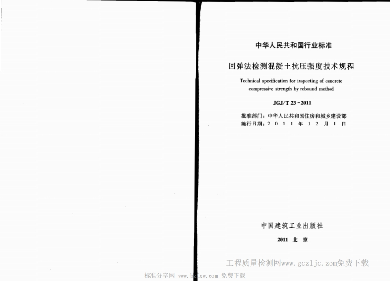 UDC中华人民共和国行业标准JEJJGJ/T23-2011P备案号J115-2011回弹法检测混凝土抗压强度技术规程Technical specification for inspecting of concretecompressive strength by rebound method2011-05-03发布2011-12-01实施中华人民共和国住房和城乡建设部发布四统一书号,15112·1769然定价111.00元