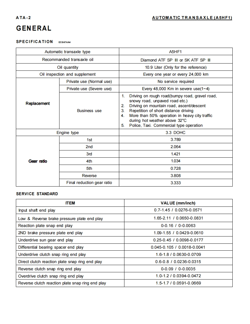 AutomaticTransaxle (A5HF1)GENERALSPECIFICATIONS.....ATA-2AUTOMATIC TRANSAXLESERVICE STANDARD.....ATA-2COMPONENTS......ATA-146TIGHTENING TORQUE............................ATA-3REMOVAL......ATA-148SEALANTS...........ATA-3INSTALLATION.......ATA-152SPECIALTOOLS..................ATA4AUTOMATIC TRANSAXLE SYSTEMINSPECTION CHART FOR DIAGNOSTICTROUBLE CODES(DTCL...........................ATA-6P0707.ATA-10P0708ATA-16P0711ATA-19P0712.........ATA-24P0713ATA-27P0717ATA29P0722.…....ATA-37P0731.ATA-430-6P0732.........ATA51P0733....ATA-59P0734ATA67P0735...........ATA-74P0736.“.......ATA-81P0741ATA-89P0742.ATA-93P0743.....ATA-94P0746.…ATA-100P0748......ATA-106P0750...ATA-108P0755ATA-114P0760.ATA-120P0765....ATA-126P0770.ATA-131P0885…ATA-136P0890ATA-139P0891..ATA-144
