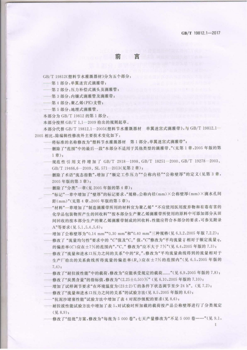 1Cs23.040.20G33GB中华人民共和国国家标准GB/T19812.1-2017代替GB/T19812.1一2005塑料节水灌溉器材第1部分:单翼迷宫式滴灌带Plastic equipment for water saving irrigation-Part 1:Drip tape with labyrinth on one side2017-11-01发布2018-05-01实施中华人民共和国国家质量监督检验检疫总局发布中国国家标准化管理委员会Φ