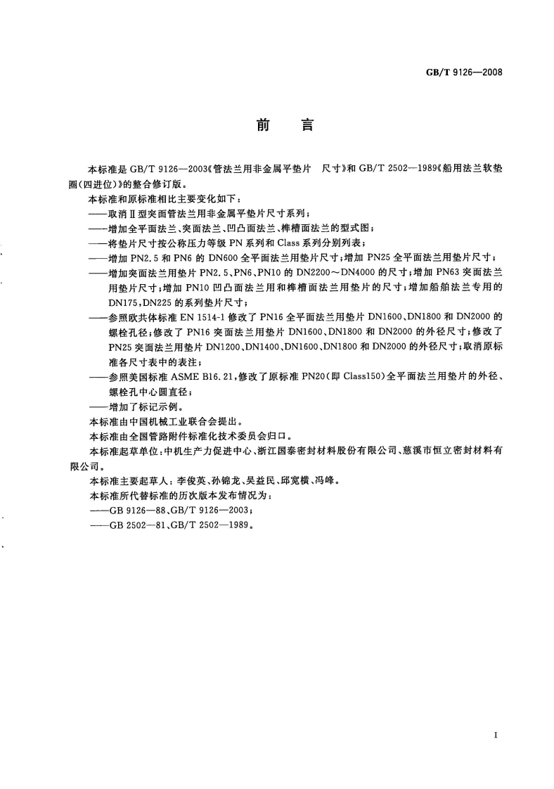 1Cs23.040.60J15GB中华人民共和国国家标准GB/T9126-2008代替GB/T9126-2003,GB/T2502一1989管法兰用非金属平垫片尺寸Dimensions of non-metallic flat gaskets for pipe flanges2008-08-25发布2009-04-01实施中华人民共和国国家质量监督检验检疫总局、蚊码防伪中国国家标准化管理委员会发布