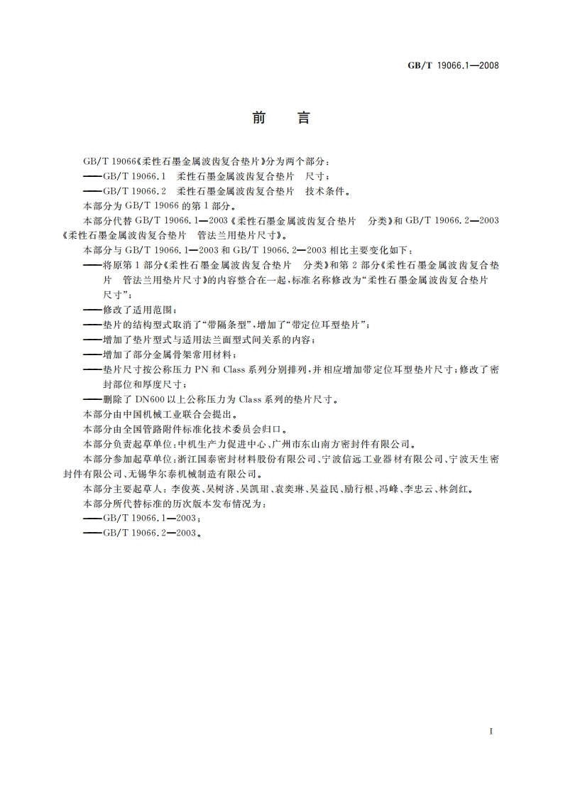 ICS23.040.60J15中华人民共和国国家标准GB/T19066.1-2008代替GB/T19066.1一2003,GB/T19066.2一2003柔性石墨金属波齿复合垫片尺寸Dimensions for flexible graphite covered wave-serrated metal gaskets2008-08-25发布2009-04-01实施中华人民共和国国家质量监督检验检疫总局中国国家标准化管理委员会发布