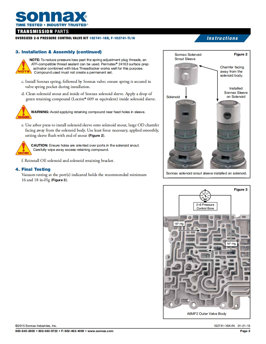 sonnaxTIME TESTED.INDUSTRY TRUSTEDTRANSMISSION PARTSInstructionsHyundai/Kia A6GF1,A6LF1/2/3,A6MF1/2Oversized 2-6Pressure ControlValve KitPart No.Spring102741-16KSolenoidSnout·Vave2-6 PressureSleeve·SpringControl BoreSolenoid Snout SleeveTool KitKitPart No.哥A6MF2 OuterValve BodyF-102741-TL16·Reamer·Reamer Jig。Guide PinCAUTON:Prior to removal of spring adjustment plug,measure and record distance fromend of plug to the casting.This dimension must be matched during reassembly.NOTE:Sonnax "F-Tool"kits designed toservice a specific bore require the VB-FIX,a self-aligning valve body reaming fixture.1.DisassemblyFigure 1More infomation and instructions can bea.Remove and save OE adjustment plugfound online at www.sonnax.com.retaining clip.b.Measure and record adjustment plug-to-casting distance,then remove and saveOE adjustment plug (Figure 1).ABSOLUT限c.Remove OE solenoid retaining bracketand solenoid.Set both aside for reuse.d.Remove and discard OE valve and spring.2.Bore ReamingReam 2-6 pressure control valve bore (forreaming instructions/reamer care,please visitwww.sonnax.com).Sonnax reaming tool kit F-102741-TL16 and VB-FIX are requiredfor this operation.3.Installation Assemblya.Be certain all debris has been removed from valve bore and body.b.Reinstall OE spring adjustment plug and set to the reference dimension noted in disas-sembly procedure,then reinstall OE adjustment plug retaining dip.2015 Sonnax Industries,Inc.102741-16K-N01-21-15800-843-2600·802-463-9722·F:802-4634059·www.50nnax.comPage 1