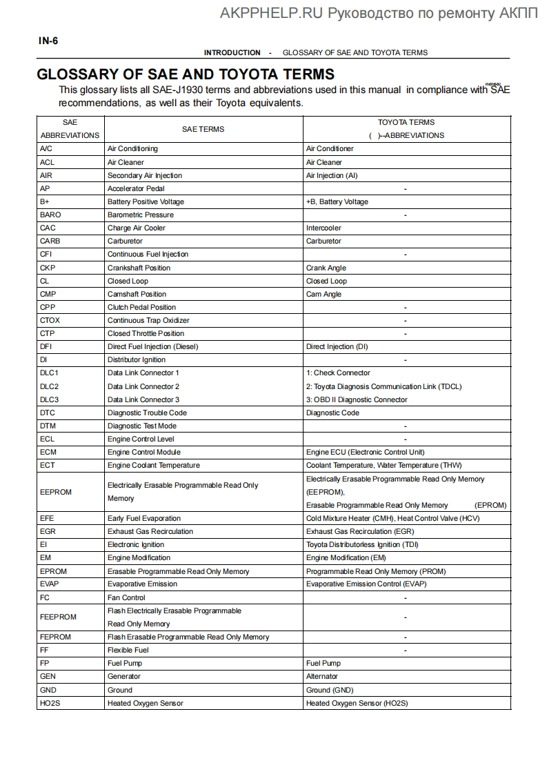 AKPPHELP.RU PykoBOACTBo no peMoHTy AKnnIN-9INTRODUCTION ABBREVIATIONS USED IN THIS MANUALABBREVIATIONS USED IN THISMANUALATFAutomatic Transmission FluidBoOverdrive BrakeB1No.1 BrakeB2No.2 BrakeB3No.3 BrakeCoOverdrive Direct ClutchC1Front ClutchC2Rear ClutchDDiscFlangeFoO/D One-way ClutchF1No.1 One-way ClutchF2No.2 One-way ClutchMPMultipurposeO/DOverdirvePPlateSSMSpecial Service MaterialsSSTSpecial Service Tools