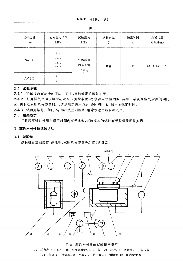 中华人民共和国国家标准GB/T14180-93缠绕式垫片试验方法GB4620一84代替Test methods for spiral wound gasketsGB4621-841主题内容与适用范围本标准规定了缠绕式垫片水压及蒸汽密封性能试验的试验机,试样和试验步骤等。本标准适用于试验缠绕式垫片的水压密封性能和蒸汽密封性能。2水压密封性能试验方法2.1试验机试验机由加载装置、法兰、水压负荷装置和相应的指示仪表组成(见图1)。狗紫比R图1水压密封性能试验机示意图1一阀门K12一试片:3一上法兰:4一压力表:5一水泵,6一阀门K2:7一下法兰2.1.1加载采用液压方式,也可采用螺栓连接,以提供足够的预紧比压并能保持试验所规定的时间。2.1.2法兰用于安装试片,采用凸平面式法兰,密封面表面粗糙度为3%材料为20号钢。2.1.3水压负荷装置要保证供给规定的压力,并能使该压力保持规定的时间。2.1.4压力表精度为1.5级。2.2试样试样的规格按表1规定。2.3试验亲件试验条件按表1规定。国家技术监督局1993-02-19批准1993-10-01实施