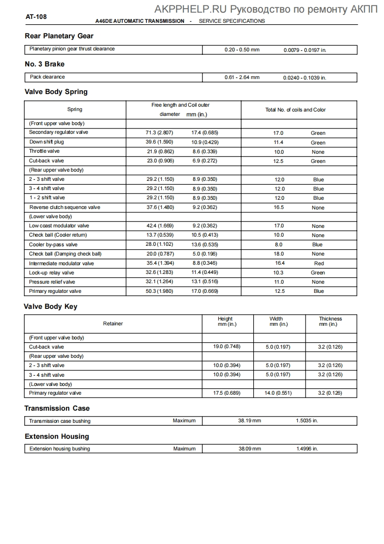 AKPPHELP.RU PyKoBOACTBo no peMoHTy AKnnAT-107A46DE AUTOMATIC TRANSMISSION SERVICE SPECIFICATIONSSERVICE SPECIFICATIONSSERVICE DATEOil PumpBody clearanceSTD0.07-0.15mm0.0028-0.0059in.Maximum0.3mm0.012inTip clearanceSTD0.11-0.14mm0.0043-0.0055in.Maximum0.3mm0.012in.Side clearanceSTD0.02-0.05mm0.0008-0.0020in.Maximum0.1mm0.004in.Pump body bushing inside diameterMaximum38.19mm1.5035in.Stator shaft bushing inside diameterFrontsideMaximum21.58mm0.8496in.Rear sideMaximum23.10mm0.9094in.Overdrive Direct ClutchClutch drum bushing inside diameterMaximum23.14mm0.9110in.Overdrive direct clutch piston stroke1.77.2.58mm0.0697-0.1016inOverdrive planetary gear bushingMaximum11.27mm0.4437inPlanetary pinion gear thrust clearanceSTD0.20-0.50mm0.0079-0.0197in.Overdrive BrakePack clearance0.35-1.91mm0.0138-0.0752in.Front ClutchPiston stroke1.40-2.48mm0.0551-0.0976in.Flange thickness1.8mm0.071in2.0mm0.079inRear ClutchPiston stroke0.90-1.75mm0.0354-0.0689in.No.1 BrakePiston stroke0.80-1.73mm0.0315-0.0681in.Center support bushing inside diameterMaximum36.46mm14354inNo.2 BrakePiston stroke1.01-2.25mm0.0398-0.0886in.Planetary Sun GearMaximum inside diameter21.58mm0.8496inFront Planetary GearPlanetary pinion gear thrust clearance0.20-0.50mm0.0079-0.0197im.