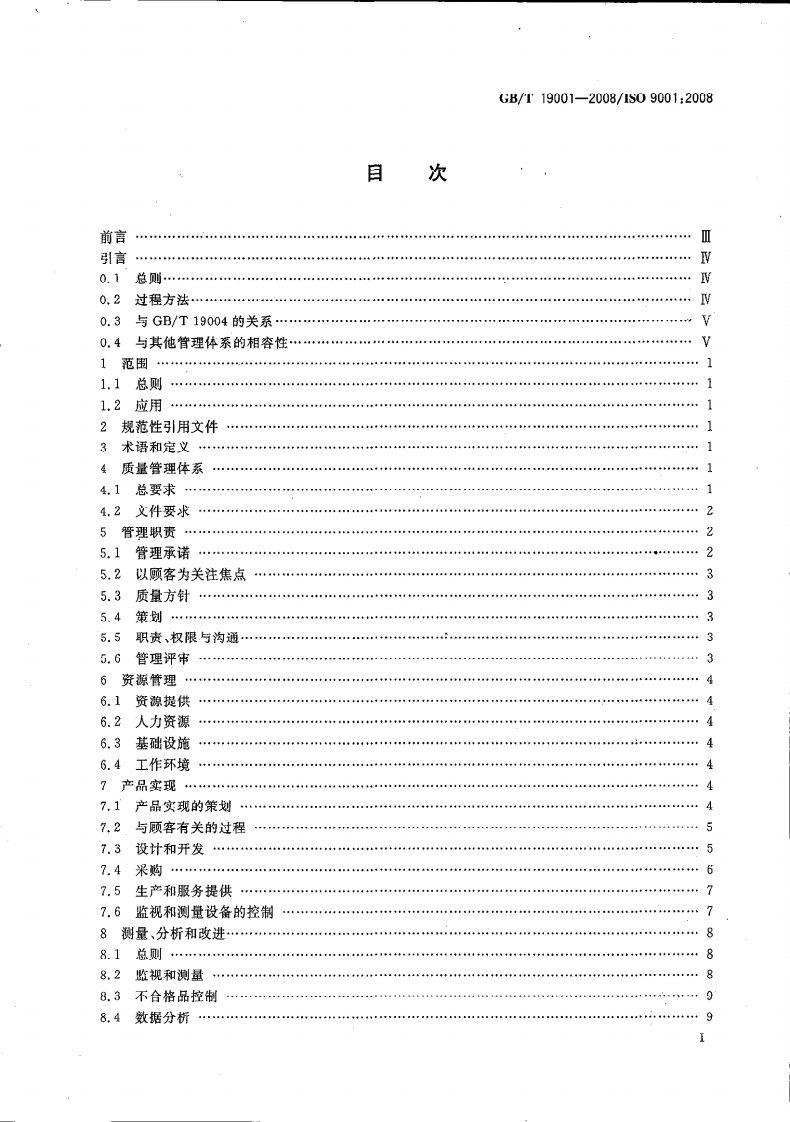1CS03.120.10A00GB中华人民共和国国家标准GB/T19001-2008/IS09001:2008代替GB/T19001一2000质量管理体系要求Quality management systems-Requirements(ISO9001:2008,IDT)2008-12-30发布2009-03-01实施中华人民共和国国家质量监督检验检疫总局数码防伪中国国家标准化管理委员会发布
