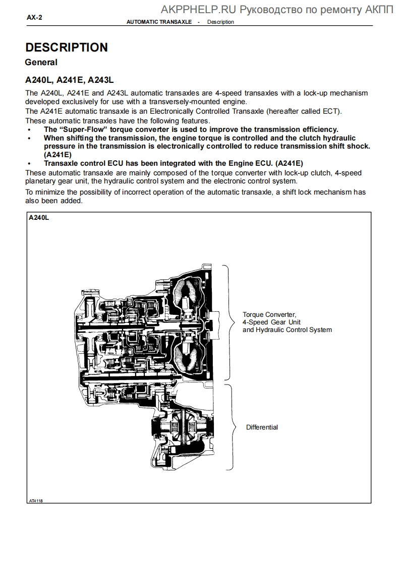AKPPHELP.RU PyKoBOACTBo no peMoHTy AKnnIN-6INTRODUCTION Abbreviations Used in This ManualABBREVIATIONS USED IN THIS MANUALA/T ATMAutomatic TransmissionATFAutomatic Transmission FluidSecond Coast Brake2Second BrakeFirst and Reverse BrakeUnderdrive BrakeForward ClutchDirect Clutch99908F125Underdrive ClutchDiscExceptFlangeNo.1 One-way ClutchNo.2 One-way ClutchUnderdrive One-way ClutchMultipurposeO/DOverdrivePPlateSSMSpecial Service MaterialsSSTSpecial Service ToolsSTDStandardTICTorque ConverterT/FTransferU/DUnderdrivewith4WDFour Wheel Drive