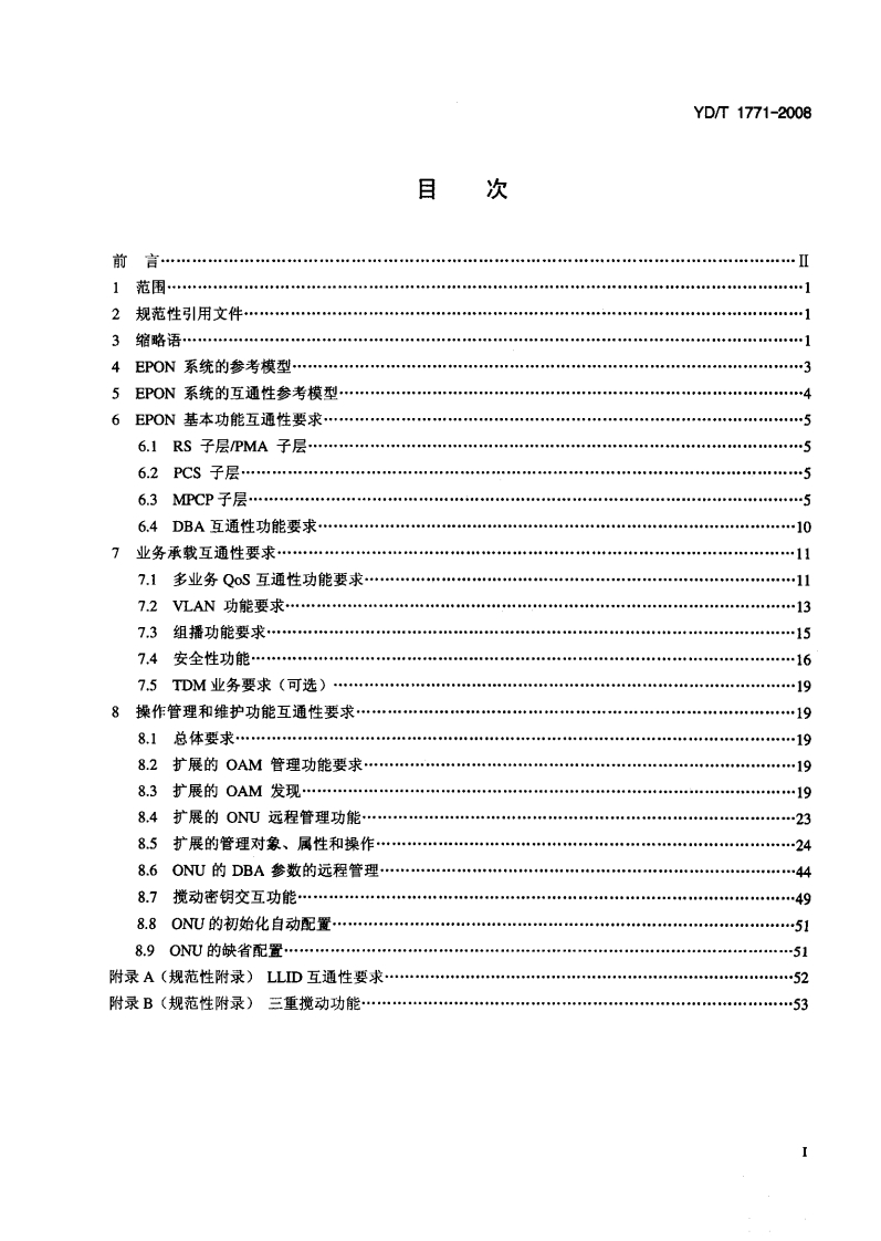 YD-T1771-2008348072@abc6个月前发布关注私信2.10MB58页025YD-T1771-2008此内容为付费资源,请付费后查看¥17¥23黄金会员免费钻石会员免费立即购买您当前未登录!建议登陆后购买,可保存购买订单付费资源 第1页 / 共58页 第2页 / 共58页 试读已结束,还剩56页,您可下载完整版后进行离线阅读 THE END标准规范 文本预览 1CS3304050M42YD中华人民共和国通信行业标准YD/T1771-2008接入网技术要求一EPON系统互通性Technical Requirements for Access Networks-Interoperability of EPON Systems2008-03-13发布2008-07-01实施中华人民共和国信息产业部发布 查看更多 收起部分 喜欢就支持一下吧收藏