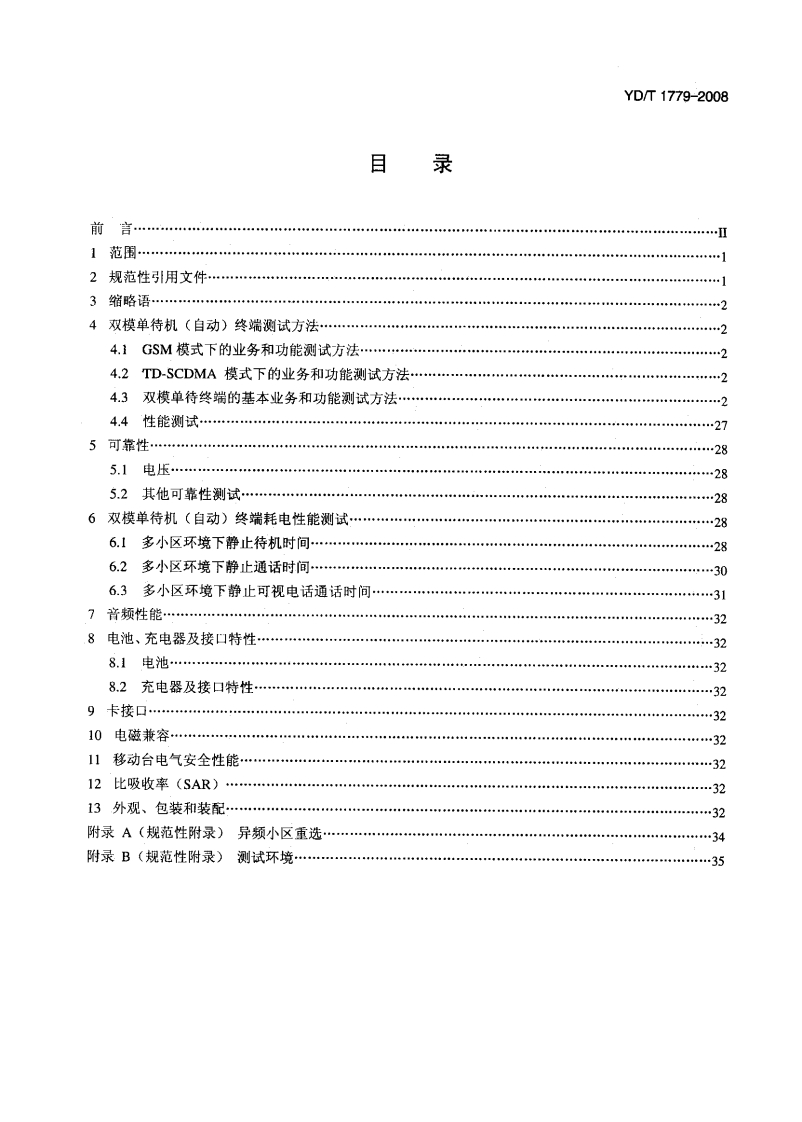 YD-T1779-2008348072@abc6个月前发布关注私信1.11MB38页033YD-T1779-2008此内容为付费资源,请付费后查看¥17¥23黄金会员免费钻石会员免费立即购买您当前未登录!建议登陆后购买,可保存购买订单付费资源 第1页 / 共38页 第2页 / 共38页 试读已结束,还剩36页,您可下载完整版后进行离线阅读 THE END标准规范 文本预览 1CS3306099M36YD中华人民共和国通信行业标准YD/T1779-2008TD-SCDMA/GSM(GPRS)双模单待机数字移动通信终端测试方法Testing Methods of TD-SCDMA/GSM(GPRS)Dual Mode Digital Mobile User Equipment2008-03-28发布2008-06-01实施中华人民共和国工业和信息化部发布 查看更多 收起部分 喜欢就支持一下吧收藏
