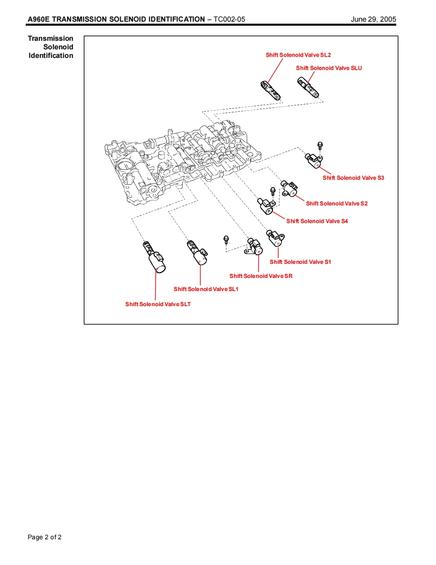 LEXUSTitle:A960E TRANSMISSION SOLENOIDTechnical ServiceIDENTIFICATIONInformation BulletinModels:7G002-05June29,200506GS300TRANSMISSIONIntroductionThis service bulletin provides information on the proper identification of the 9 solenoidsused in the A960E transmission.CLUTCHApplicable2006 model year GS 300 vehicles equipped with 2 wheel drive.VehiclesParts Provided below is a chart listing the repair manual name of each solenoid used inInformationthe A960E transmission as well as the part name description provided in the electronicparts catalog.REPAIRMANUALSOLENOID NAMEPART CATALOG DESCRIPTIONS1Solenoid Assembly,Automatic Transmission 3-Way No.1S2Solenoid Assembly,Automatic Transmission 3-Way No.2S3Solenoid Assembly,Automatic Transmission 3-Way No.1S4Solenoid Assembly,Automatic Transmission 3-Way No.3SRSolenoid Assembly,Automatic Transmission 3-Way No.4SL1Solenoid Assembly,Clutch Control No.1SL2Solenoid Assembly,Clutch Control No.2SLTSolenoid Assembly,Line Pressure ControlSLUSolenoid Assembly,Lock-up ControlNOTE:Part numbers have not been included due to possible future part number changes.Refer to the parts catalog for proper current part number.WarrantyOP CODEDESCRIPTIONTIMEOFPT1T2InformationNIANot Applicable to Warranty-Lexus SupportsASE CertificationPage 1 of2