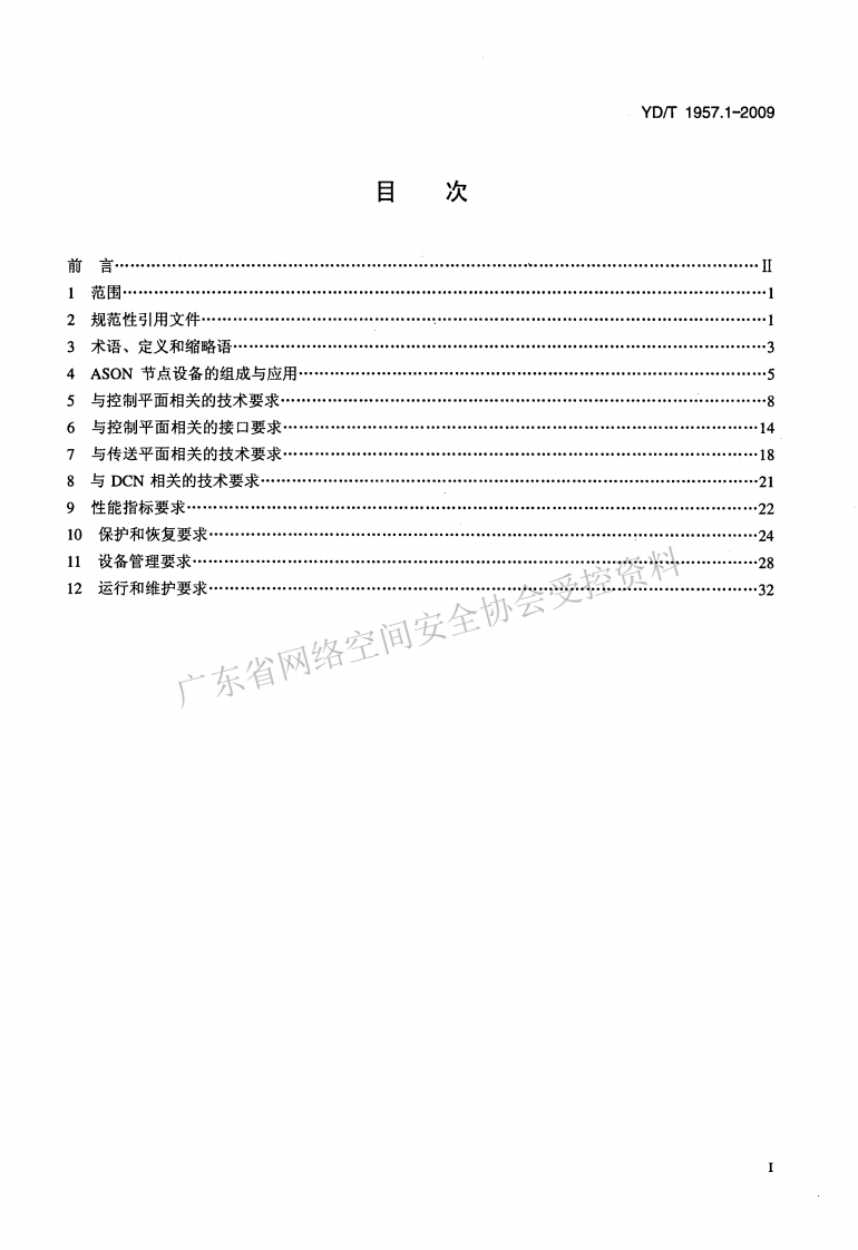 1CS33.040.20M33YD中华人民共和国通信行业标准YD/T1957.1-2009自动交换光网络(ASON)节点设备技术要求第1.部分:基于同步数字体系SDH)的ASON东省节点设备技术要求Technical Requirements for Automatically Switched OpticalNetwork(ASON)NodePart 1:Technical Requirements for SDH-based ASON Node2009-06-15发布2009-09-01实施中华人民共和国工业和信息化部发布