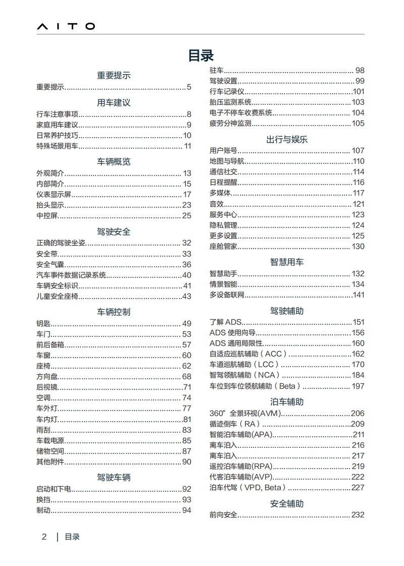 入IT前言尊敬的用户,感谢您选择AT0汽车的问界新M52025款纯电版车型(以下简称“M5纯电”)。在使用M5纯电车型的过程中,您将获得ATO汽车贴心的服务体验。在使用M5纯电前请您认真阅读本手册内容,并妥善保存本手册。您能从本手册中了解车辆功能、使用注意事项,以及车辆维护和定期保养的信息,以帮助您安全地驾驶和延长车辆使用寿命。切勿私自改装车辆的任何一个零部件、车辆信息及标识等,改装可能会影响车辆的性能,甚至可能违反国家法规。为持续提升您的驾乘体验,ATO汽车可能在不另行通知的情况下对车辆进行优化改进,届时请以实车为准。您可以通过以下方式获取完整的车辆使用信息:·中控屏:打开服务与应用>应用中心内的车主指南应用。·手机:打开ATO应用,进入我的>车主指南。·ATO官网:打开AITO汽车官方网站https:l∥aito.auto,进入服务>使用说明书。本手册版权归赛力斯汽车有限公司所有。未经赛力斯汽车有限公司书面同意,不得转载、复印或翻译手册内容。如果您有任何问题、意见或建议,请致电400-008-9999联系我们。车辆制造厂:赛力斯汽车有限公司地址:重庆市江北区福生大道229号网址:https://aito.auto前言|1