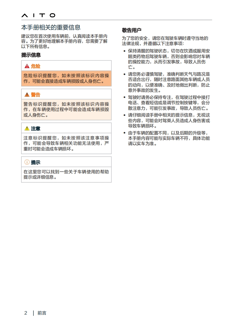 ○前言尊敬的用户,感谢您选择ATO品牌的问界新M5增程版车型(以下简称“新M5增程版”)。在使用新M5增程版车型的过程中,您将获得ATO汽车贴心的服务体验。在使用新M5增程版前请您认真阅读本手册内容,并妥善保存本手册。您能从本手册中了解车辆功能、使用注意事项,以及车辆维护和定期保养的信息,以帮助您安全地驾驶和延长车辆使用寿命。为持续提升您的驾乘体验,ATO汽车可能在不另行通知的情况下对车辆进行优化改进,届时请以实车为准。切勿私自改装车辆的任何一个零部件、车辆信息及标识等,改装可能会影响车辆的性能,甚至可能违反国家法规。您可以访问AITO汽车官方网站:https:/lato.auto,进入“服务>使用说明书”获取完整的信息,或通过车辆中控屏、手机获取车主指南最新信息。·中控屏:打开“服务与应用>应用中心”内的“车主指南”应用。·手机:打开“ATO”应用,进入“我的>车主指南”。本手册版权归赛力斯汽车有限公司所有。未经赛力斯汽车有限公司书面同意,不得转载、复印或翻译手册内容。如果您有任何问题、意见或建议,请致电AT0用户关怀中心:400-008-9999联系我们。车辆制造厂:赛力斯汽车有限公司地址:重庆市江北区福生大道229号网址:https://aito.auto前言|1