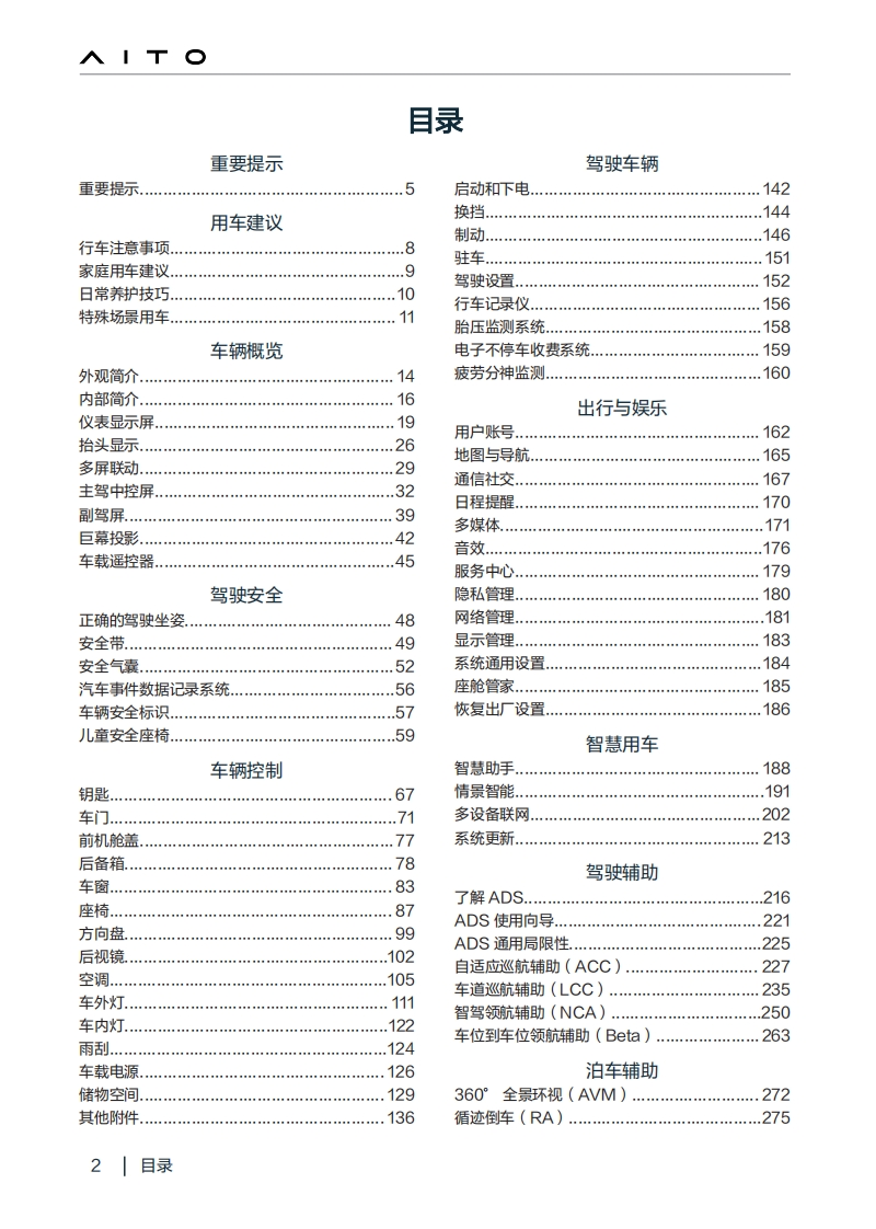 入IT○前言尊敬的用户,感谢您选择ATO汽车的问界M92025款增程版车型(以下简称“M9”)。在使用M9车型的过程中,您将获得AITO汽车贴心的服务体验。在使用M9前请您认真阅读本手册内容,并妥善保存本手册。您能从本手册中了解车辆功能、使用注意事项,以及车辆维护和定期保养的信息,以帮助您安全地驶和延长车辆使用寿命。切勿私自改装车辆的任何一个零部件、车辆信息及标识等,改装可能会影响车辆的性能,甚至可能违反国家法规。为持续提升您的驾乘体验,ATO汽车可能在不另行通知的情况下对车辆进行优化改进,届时请以实车为准。您可以通过以下方式获取完整的车辆使用信息:·中控屏:打开服务与应用>应用中心内的车主指南应用。·手机:打开ATO应用,进入我的>车主指南。·ATO官网:打开AITO汽车官方网站https:/∥aito.auto,进入服务>使用说明书。本手册版权归赛力斯汽车有限公司所有。未经赛力斯汽车有限公司书面同意,不得转载、复印或翻译手册内容。如果您有任何问题、意见或建议,请致电400-008-9999联系我们。车辆制造厂:赛力斯汽车有限公司地址:重庆市江北区福生大道229号网址:https://aito.auto前言|1