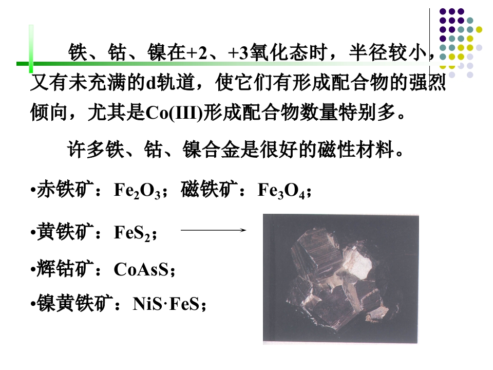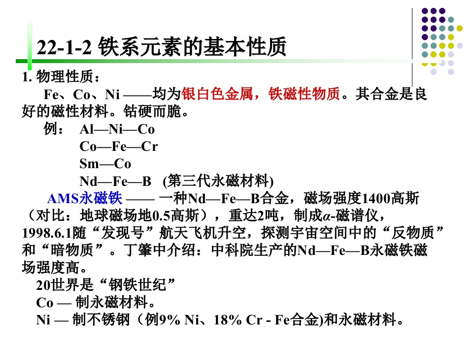 22第二十二章铁系元素和铂系元素348072@abc4天前发布关注私信1.84MB95页04622第二十二章铁系元素和铂系元素此内容为付费资源,请付费后查看¥9¥13黄金会员免费钻石会员免费立即购买您当前未登录!建议登陆后购买,可保存购买订单付费资源 第1页 / 共95页 第2页 / 共95页 第3页 / 共95页 试读已结束,还剩92页,您可下载完整版后进行离线阅读 THE ENDPPT模板实习实践实用范文 文本预览 22-1铁、钴、镍的单质Ⅷ族FeCoNi铁系RuRhPd铂系OsIrPtJ价电子构型重要氧化值Fe3d64s2+2,+3,(+6)Co3d74s2+2,+3,(+5)Ni3d84s2+2,+3,(+4)最高氧化值不等于族序数。 查看更多 收起部分 喜欢就支持一下吧收藏