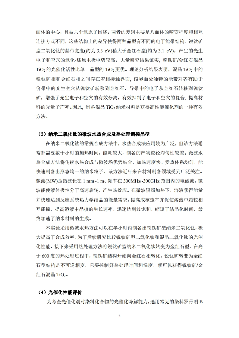 纳米二氧化钛的微波水热合成、晶型调控及其光催化性能研究一、实验目的1.掌握微波水热合成纳米二氧化钛及热处理调控晶型的方法:2.了解二氧化钛晶体结构的表征技术及数据分析方法:3.理解光催化降解污染物的机理并掌握光催化材料性能的评价方法。二、实验原理(1)二氧化钛光催化及其污染物降解原理近年来光催化在能源、环境污染物处理及催化合成等领域得到了广泛应用,成为国际上最活跃的研究领域之一。在研究者开发的众多光催化剂中,二氧化钛具有紫外活性高、无毒、廉价及稳定性高等优点,二氧化钛光催化剂的相关研究最为深入。在环境化学领域,二氧化钛光催化剂常用于降解各种有机污染物如染料及抗生素等,也可杀灭多种病原微生物用于水消毒。光催化降解在常温常压下就可以进行,仅需要太阳光、空气和水,具有成本低、效率高、二次污染少的优点。根据目前的光催化理论,半导体光催化剂受光激发后会产生电子和空穴。二氧化钛的禁带宽度为3.0~3.2V,当受到大于禁带宽度能量的光子照射后,价带中的电子就会被激发到导带,产生高活性电子e和空穴h(见示意图1及公式1)。电子具有还原性,空穴具有氧化性。激发态的导带电子和价带空穴也可以重新复合,使光能以热或其他形式散发掉(见公式2)。TiO2+hv→e+h(1)e+h→热量(2)一般而言,TO2的光催化离不开空气和水溶液,这是因为水分子或氧气分子与光生电子或空穴结合可产生化学性质极为活泼的自由基,空穴与TO2表面的H20或OH反应生成氧化性很高的OH自由基,其反应历程见公式3和4:h+H2O→·OH+H(3)h+OH→OH(4)电子()与表面吸附的氧分子发生反应,经历一系列的反应历程(见公式5-10):02+e→02(5)