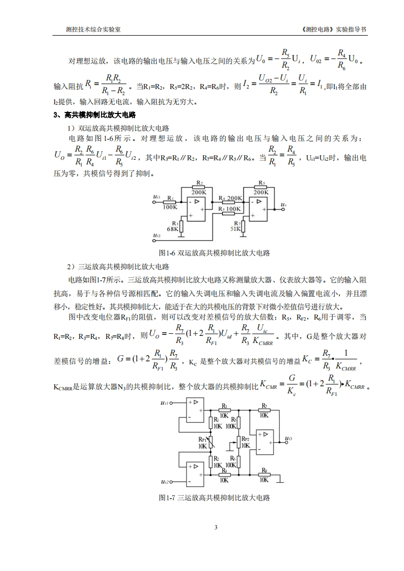 测控技术综合实验室《测控电路》实验指导书实验一信号放大电路实验一、实验目的1、研究由集成运算放大器组成的基本放大电路的功能。2、了解运算放大器在实际应用时应考虑的一些问题。二、实验原理集成运算放大器是一种具有电压放大倍数高的直接耦合多级放大电路。当外部接入不同的线性或非线性元器件组成输入和负反馈电路时,可以灵活地实现各种特定的函数关系。在线性应用方面,可以组成反相比例放大器,同相比例放大器,电压跟随器,同相交流放大器,自举组合电路,双运放高共模抑制比放大电路,三运放高共模抑制比放大电路等。理想运算放大器的特性:在大多数情况下,将运放视为理想运放,就是将运放的各项技术指标理想化,满足下列条件(如表1-1所示)的运算放大器称为理想运放。表1-1开环电压增益输入阻抗输出阻抗带宽Awl=oorfoor=0W=co失调与漂移均为零等。理想运放在线性应用时的两个重要特性:(I)输出电压U6与输入电压之间满足关系式:Uo=AudU+U-),而Uo为有限值,因此,(U+-U)=0,即U=U,称为“虚短”。(2)由于广,故流进运放两个输入端的电流可视为零,即称为“虚断”。这说明运放对其前级吸取电流极小。以上两个特性是分析理想运放应用电路的基本原则,可简化运放电路的计算。1、基本放大电路1)反向比例放大器电路如图1-1所示。对理想运放,该电路的输出电压与输入电压之间的关系为:U。=-三,为了减少检入级信置电流引起的运算误差,在同相输入端应接人平衡电阳那,R/及。R100-12Wo-12Vo22图1-1反向比例放大器图1-2同向比例放大器