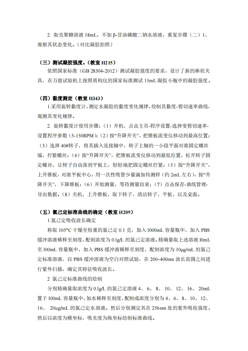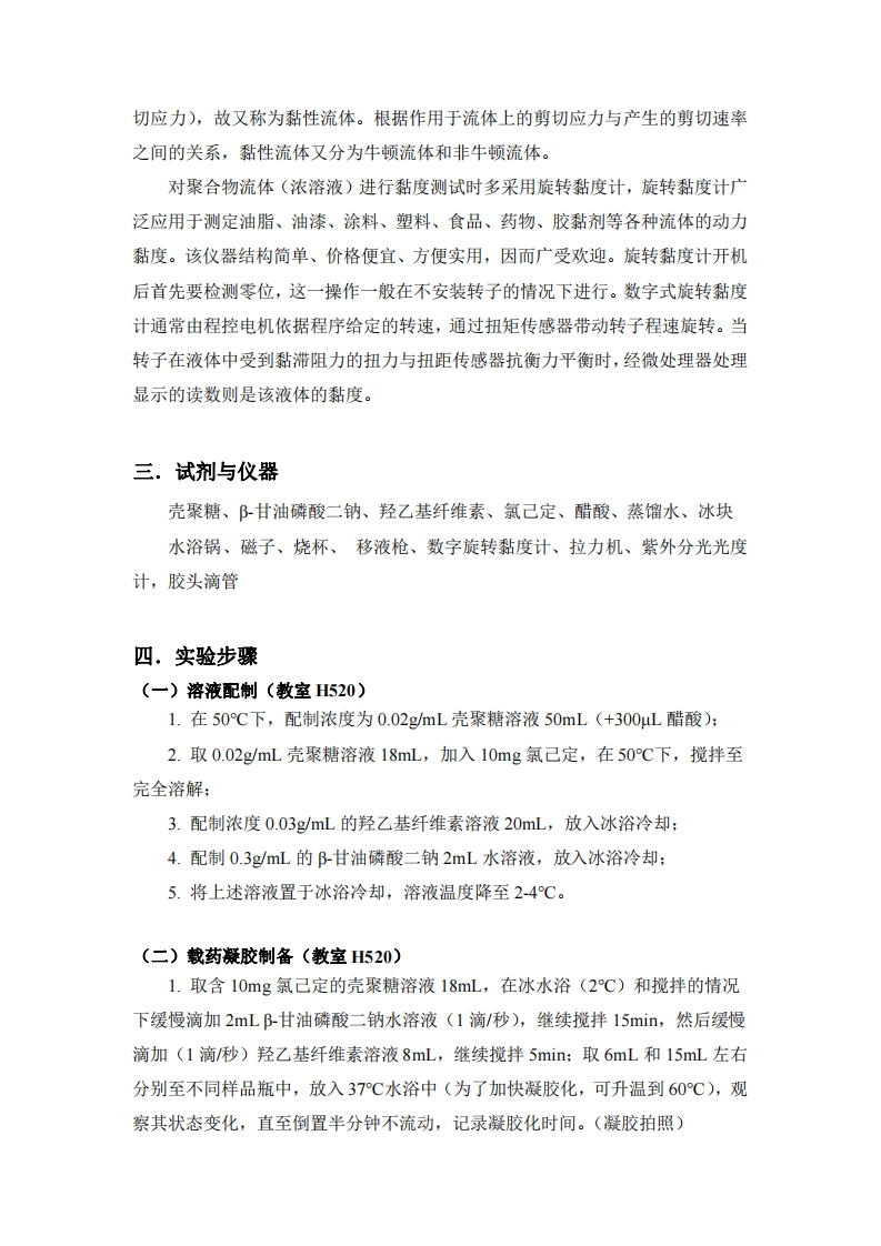 智能高分子水凝胶的制备及药物控释一.实验目的掌握可逆凝胶及载药水凝胶的制备:了解数字式旋转黏度计:掌握测定高聚物流体的流动曲线:掌握药物释放的测定二,实验原理水凝胶是一种交联的具有三维网状结构的水溶性新型功能高分子材料。由于水凝胶含水量高、溶胀快、较好的粘稠性等优点,其应用涉及许多领域,如食品工业、药物传递体系、纺织工业、造纸业等。近年来,温度敏感型水凝胶发展成为一种新的制剂,其特征是常温下呈液态,随环境温度的变化可转变为凝胶态,即在较高温度时形成凝胶,温度较低时形成溶胶。作为一种水溶性的多糖,多糖的分子链上带有很多的羟基,易于形成氢键。与其它水凝胶相比,多糖水凝胶具有很强的吸水保水性、很好的生物相容性,因此应用较广。在一般情况下,当壳聚糖溶液的pH值大于62时,壳聚糖就会从溶液中析出白色絮状物。这是因为随着pH的增加,溶液中的游离H浓度不断降低,壳聚糖分子链上的-NH不断发生去质子化,-NH数量不断减少,从而导致分子链内及分子链间的静电排斥力不断减小,当壳聚糖分子链之间的静电排斥力降低到一定程度时,壳聚糖分子链之间就会相互聚集靠拢,最终使壳聚糖从溶液中析出。而向壳聚糖溶液中加入呈碱性的B甘油磷酸钠时,当溶液的pH值大于和6.2时,在低温状态下壳聚糖仍然以溶解的形式存在于溶液中,甚至当混合溶液的pH值达到人体生理pH值范围时,壳聚糖也不会沉淀出来。主要原因是,阝甘油磷酸钠的甘油基团与水分子之间通过氢键形成结合水围绕在壳聚糖分子链周围,从而在壳聚糖分子链周围形成水壳层,阻止壳聚糖分子链相互聚集,进而防止壳聚糖从溶液中析出。按照流体力学的观点,流体可分为理想流体和实际流体两大类。理想流体在流动时无阻力,故称为非黏性流体。实际流体流动时有阻力,即内摩擦力(或剪