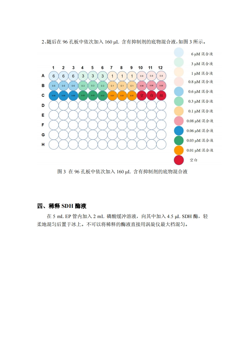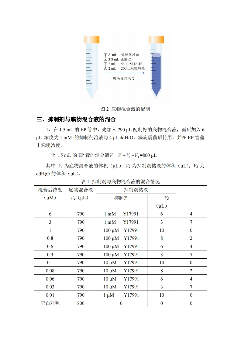 ICs0测定实验流程一、抑制剂Y17991的配制1、取原药Y17991约2mg,根据相对分子质量加入Vo mL DMS0配置成50mM的母液A,涡旋震荡后待用,并在EP管盖上标明“Y1799150mM”计算公式为,=m=m实(mg)×纯度(%)MMxc其中m实为实际称量的原药Y17991质量(mg):M为原药Y17991的相对分子量:c为母液A的浓度50mM。2、取母液A20L,加入80LDMS0,配置成10mM测试液B50mL,涡旋震荡后待用,并在EP管盖上标明“Y1799110mM”,按图1所示依次稀释得到原药Y179911mM、100M、10M、1M。10mMY1799120L100MY1799120L1mMY1799110MY17991DMSO 180 HLDMSO 180 uL1mMY1799120L10MY1799120L1MY17991100MY17991DMSO 180 uLDMSO 180 uL图1依次稀释得到原药Y179911mM、100M、10M、1uM原药Y17991二、底物混合液的配制取一个15mL离心管,依次加入8mL磷酸缓冲液,2mL200mM琥珀酸,2mL530 uM DCIP和3.8mL超纯水,涡旋震荡后待用。如图2所示。