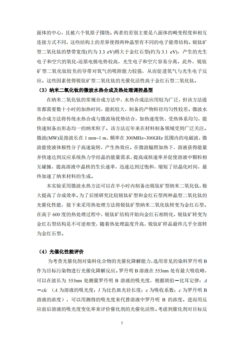 纳米二氧化钛的微波水热合成、晶型调控及其光催化性能研究一、实验目的1.掌握微波水热合成纳米二氧化钛及热处理调控晶型的方法:2.了解二氧化钛晶体结构的表征技术及数据分析方法:3.理解光催化降解污染物的机理并掌握光催化材料性能的评价方法。二、实验原理(1)二氧化钛光催化及其污染物降解原理近年来光催化在能源、环境污染物处理及催化合成等领域得到了广泛应用,成为国际上最活跃的研究领域之一。在研究者开发的众多光催化剂中,二氧化钛具有紫外活性高、无毒、廉价及稳定性高等优点,二氧化钛光催化剂的相关研究最为深入。在环境化学领域,二氧化钛光催化剂常用于降解各种有机污染物如染料及抗生素等,也可杀灭多种病原微生物用于水消毒。光催化降解在常温常压下就可以进行,仅需要太阳光、空气和水,具有成本低、效率高、二次污染少的优点。根据目前的光催化理论,半导体光催化剂受光激发后会产生电子和空穴。二氧化钛的禁带宽度为3.0~3.2V,当受到大于禁带宽度能量的光子照射后,价带中的电子就会被激发到导带,产生高活性电子e和空穴h(见示意图1及公式1)。电子具有还原性,空穴具有氧化性。激发态的导带电子和价带空穴也可以重新复合,使光能以热或其他形式散发掉(见公式2)。TiO2+hv→e+h(1)e+h→热量(2)一般而言,TO2的光催化离不开空气和水溶液,这是因为水分子或氧气分子与光生电子或空穴结合可产生化学性质极为活泼的自由基,空穴与TO2表面的H20或OH反应生成氧化性很高的OH自由基,其反应历程见公式3和4:h+HO→·OH+H(3)h+OH→·OH(4)电子()与表面吸附的氧分子发生反应,经历一系列的反应历程(见公式5-10):02+e→02(5)1