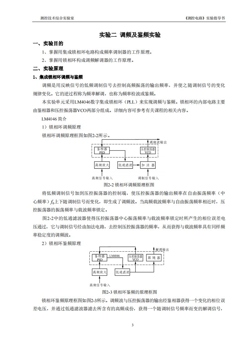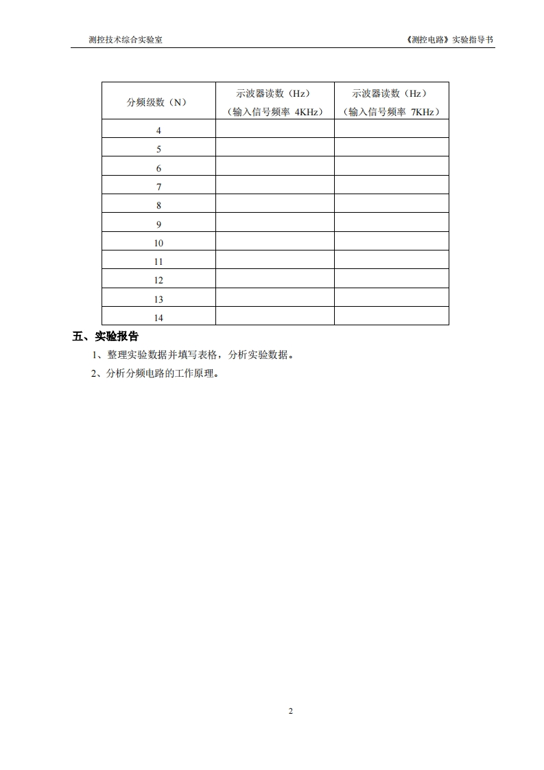 测控技术综合实验室《测控电路》实验指导书实验二分频器单元实验一、实验目的1、掌握分频器电路的工作原理和应用。2、熟悉分频器单元的使用方法。二、实验原理和电路说明1、实验电路+12V40691098ò68CLK6200luF0329013信号输入P3信号输出+12WQ164013PI0024029连接波段开关图2-1分频器单元实验电路图2、实验电路分析由图21可知,该电路的主要器件为4029(4位二进制/十进制加减计数器),器件工作在减法计数器状态下。通过波段开关将并行输入端的数据(P3,P2,P1,P0)设置为0100至1110,对应的十进制数为4至14。其中低电平通过开关直接接地,高电平通过电阻(1K)接+12V电源。图中的4013(双D触发器)构成2分频电路,因此分频为2N(N值为4至14)。三、实验仪器测控电路实验箱、示波器、信号发生器。四、实验内容与步骤1、在实验箱上找到“分频器单元”。2、调节信号发生器,使之输出幅度为3Vp-P,频率为4KHz或7KHz的方波信号,也可用其它频率,接入“分频器单元”的信号输入”端,然后用示波器的CH1、C2分别观察“信号输入”端和信号输出端的波形,调节分频级数,用示波器的频率测量功能测量输出信号端的频率,并将数据填入下表。注意:拨段开关向下拨表示“高电平1”,向上拨表示“低电平0”。波段开关从左往右依次为P3、P2、P1、P0。1