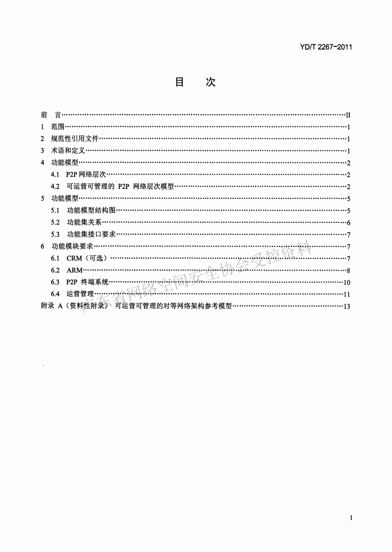 YD-T-2267-2011348072@abc4个月前发布关注私信1.52MB18页046YD-T-2267-2011此内容为付费资源,请付费后查看¥17¥23黄金会员免费钻石会员免费立即购买您当前未登录!建议登陆后购买,可保存购买订单付费资源 第1页 / 共18页 第2页 / 共18页 试读已结束,还剩16页,您可下载完整版后进行离线阅读 THE END标准规范 文本预览 1CS33.040.40M32YD中华人民共和国通信行业标准YD/T2267-2011控资料可运营可管理的对等网络(Peer to Peer)广东省网网络技术架构Operable and manageable peer topeer network technical architecture2011-06-01发布2011-06-01实施中华人民共和国工业和信息化部发布 查看更多 收起部分 喜欢就支持一下吧收藏