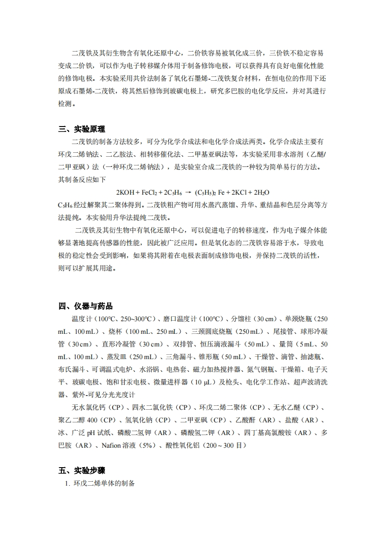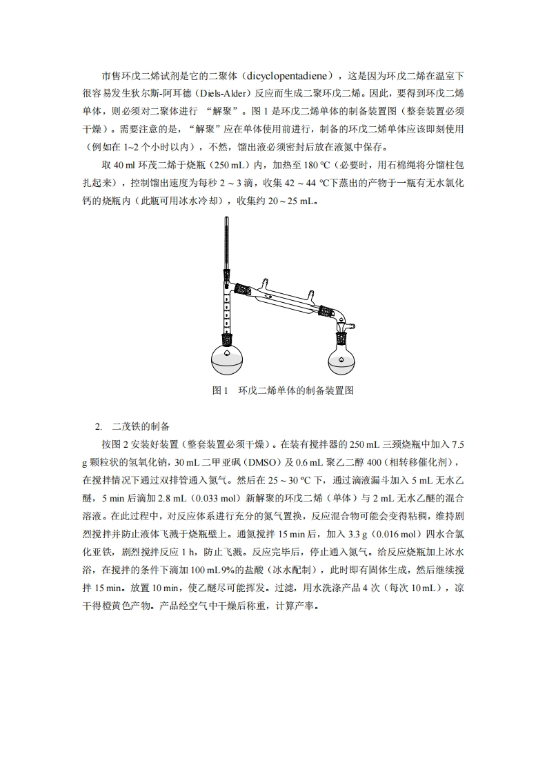 二茂铁的制备及其电化学性质一、实验目的1.学习二茂铁的制备原理和方法:2.学习无机制备中无水无氧实验操作的基本技能:3.学习升华法纯化化合物的操作技能:4.了解二茂铁的基本性质:5.循环伏安法检测二茂铁的电化学性质。二、背景知识二茂铁(Ferrocene),又名双环戊二烯铁,化学式为CHs)2Fe,具有独特的夹心结构,是目前已知的最稳定的金属有机化合物。二茂铁的发现具有偶然性。1951年,美国杜肯大学(Duquesne University)的Pauson和Keay用氯化铁氧化环戊二烯基溴化镁,试图得到二烯氧化偶联的产物富瓦烯(Fulvalene),实际得到是一个很稳定的橙黄色固体'。与此同时,Miller、Tebboth和Tremaine在将环戊二烯与氮气混合气通过一种还原铁催化剂时也得到了该橙黄色固体2。Woodward富瓦烯橙黄色因体和Wilkinson等3及Fischer等4分别独自发现了二茂铁的夹心结构,并且Fischer等还在此基础上开始合成二茂镍和二茂钴。二茂铁的夹心结构被后来的NMR光谱和X射线晶体学的研究结果所证实5,6。二茂铁的发现具有里程碑式的意义,为有机金属化学掀开了新的帷幕,并从此进入了快速发展时期。l973年Fischer及Wilkinson被授子诺贝尔化学奖,以表彰他们在有机金属化学领域的杰出贡献。二茂铁在常温下为橙色晶体,有如樟脑的气味。熔点173174℃,沸点249℃,在温度高于100℃时易升华。能溶于苯、乙醚、石油醚等大多数有机溶剂中,基本上不溶于水,在沸腾的烧碱溶液或盐酸溶液中不溶解亦不分解。在乙醇或己烷中的紫外光谱于325m(ε=50)和440nm(e=87)处有最大吸收值。在化学性质上,二茂铁与芳香族化合物相似,不容易发生加成反应,容易发生亲电取代反应,可进行金属化、酰基化、烷基化、磺化、甲酰化以及配合体交换等反应,从而可制备一系列用途广泛的衍生物。现如今,二茂铁及其衍生物已被用作火箭燃料添加剂,以改善其燃烧性能:还可用作汽油的抗震剂、硅树脂和橡胶的热化剂、紫外光的吸收剂等。