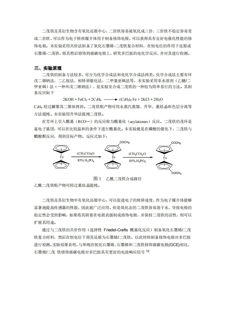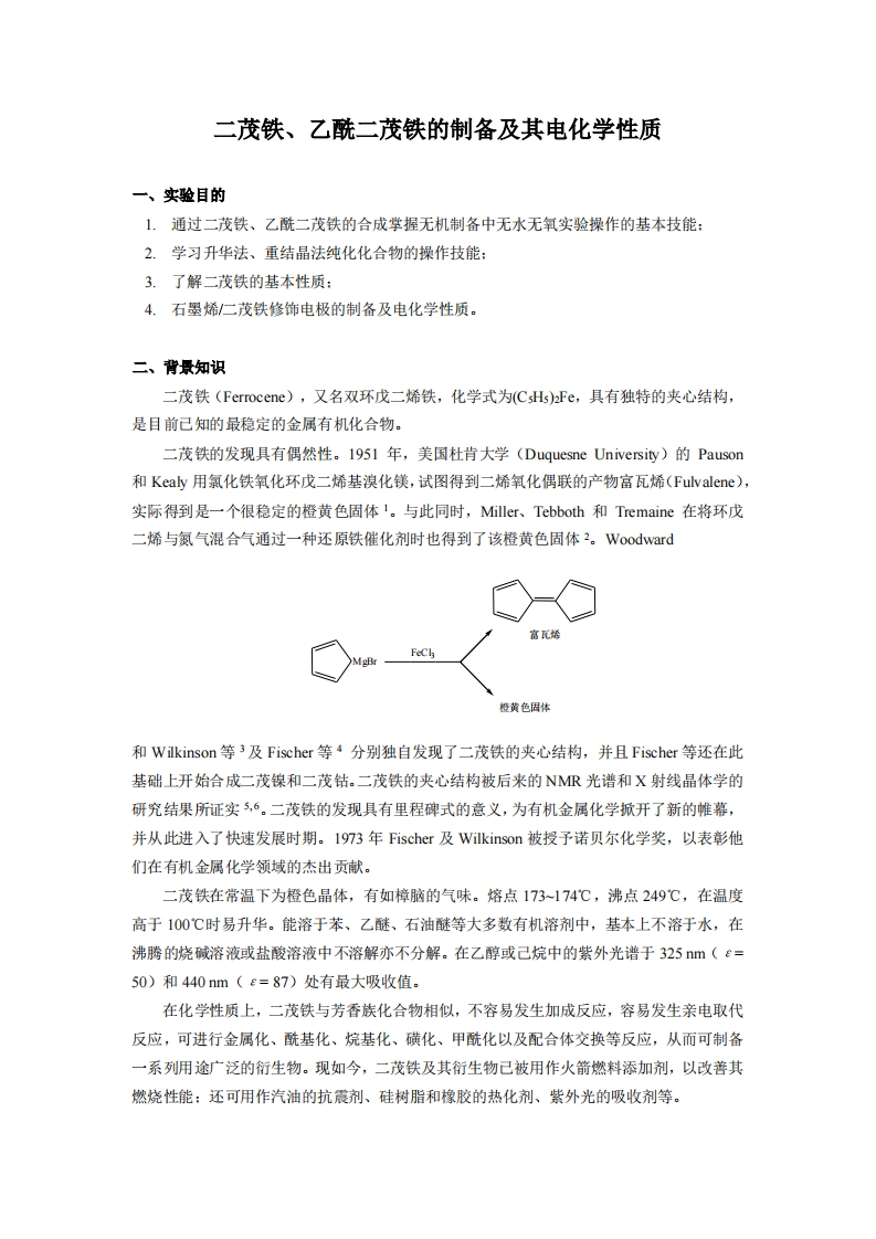 实验六二茂铁-乙酰二茂铁的制备及其电化学性质实验讲义348072@abc4天前发布关注私信0.70MB9页028实验六二茂铁-乙酰二茂铁的制备及其电化学性质实验讲义此内容为付费资源,请付费后查看¥9¥13黄金会员免费钻石会员免费立即购买您当前未登录!建议登陆后购买,可保存购买订单付费资源 第1页 / 共9页 第2页 / 共9页 第3页 / 共9页 试读已结束,还剩6页,您可下载完整版后进行离线阅读 THE ENDPPT模板实习实践实用范文 文本预览 華草中師统大鉴CENTRAL CHINA NORMAL UNIVERSITY华中师范大学化学学院综合化学实验教学讲义实验六课程名称:二茂铁、乙酰二茂铁的制备及其电化学性质 查看更多 收起部分 喜欢就支持一下吧收藏