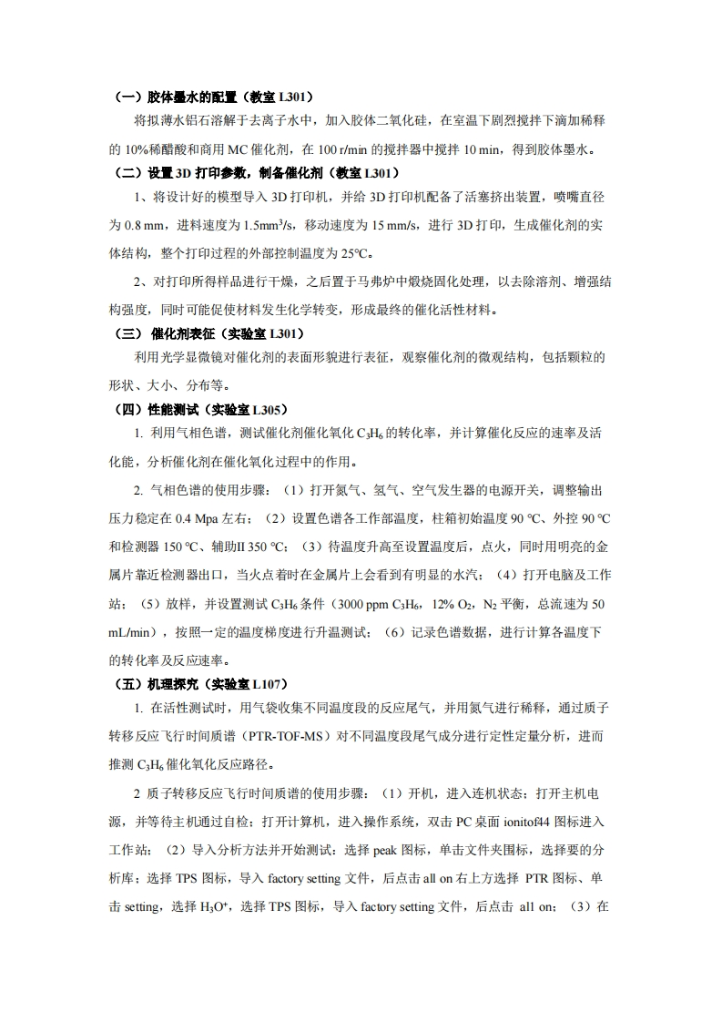 第一章挥发性有机污染物吸附与催化化学(讲解1学时,研讨1学时,实验6学时)【散学目标】1.理解挥发性有机污染物(VOCs)的定义、来源、危害及控制的重要性2.掌握催化剂在VOCs氧化过程中的作用机制3.理解3D打印技术的基本原理,了解3D打印技术在催化剂制备领域的应用4.学习催化剂的制备方法,掌握催化剂的测试和表征技术【敢学重点、难点】1.理解催化剂在VOCs吸附和催化过程中的作用机制2.催化剂的制备3.催化剂的性能测试及CH6反应的机理研究【教学和学习建议】1.教学建议:理论讲解:在进行实验之前,首先讲解VOCs的定义、来源及危害:并介绍3D打印技术制备催化剂的原理,阐述催化剂、吸附材料的特点及催化氧化VOCs的作用机制,让学生了解实验的目的和意义。演示实验过程:老师可以进行实验的演示,展示制备催化剂制备步骤和催化剂表征测试的过程,让学生对实验有直观地了解。实验设计:在学生掌握基本知识后,老师应指导学生进行实验设计,包括确定实验的目的、选取合适的材料和方法等。实验操作指导:在实验进行过程中,老师应对学生进行实时的操作指导,确保实验的顺利进行,同时提醒学生注意实验中的安全事项。数据处理和分析:实验结束后,老师应指导学生对实验数据进行处理和分析,培养学生的实验数据处理和解读能力。2.学习建议:阅读相关文献:在进行实验之前,学生可以通过阅读相关文献,了解3D打印技术及催化剂催化氧化去除VOCs的作用机制,为实验的进行做好准备。实验前准备:学生在进行实验之前,应详细了解实验的目的和步骤,准备好所需的实验器材和试剂,确保实验的顺利进行。实验操作规范:学生在进行实验时,应严格按照实验操作规范进行操作,注意实验的安全性,并及时记录实验数据和观察结果。实验数据处理:学生在实验结束后,应对实验数据进行处理和分析,绘制相关的图表,并结合实验结果进行讨论,总结实验的结论。学习交流与合作:学生可以通过与同学进行学习交流和合作,共同解决实验中遇到的问