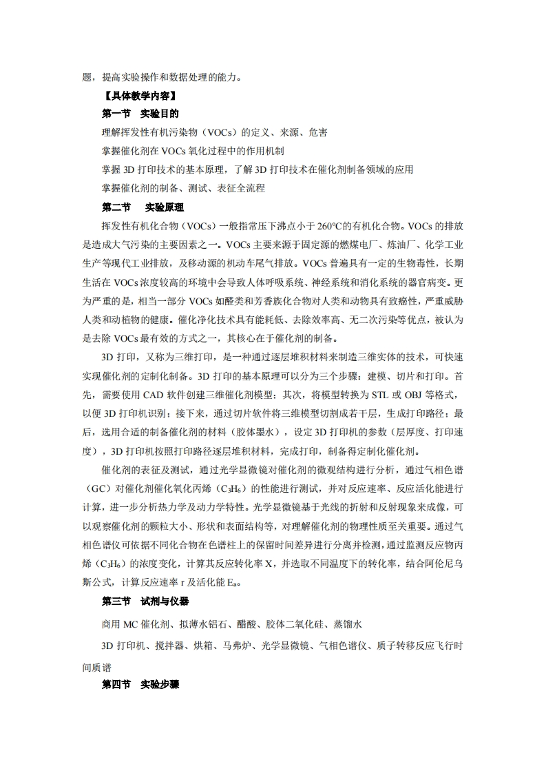 第一章挥发性有机污染物吸附与催化化学(讲解1学时,研讨1学时,实验6学时)【散学目标】1.理解挥发性有机污染物(VOCs)的定义、来源、危害及控制的重要性2.掌握催化剂在VOCs氧化过程中的作用机制3.理解3D打印技术的基本原理,了解3D打印技术在催化剂制备领域的应用4.学习催化剂的制备方法,掌握催化剂的测试和表征技术【敢学重点、难点】1.理解催化剂在VOCs吸附和催化过程中的作用机制2.催化剂的制备3.催化剂的性能测试及CH6反应的机理研究【教学和学习建议】1.教学建议:理论讲解:在进行实验之前,首先讲解VOCs的定义、来源及危害:并介绍3D打印技术制备催化剂的原理,阐述催化剂、吸附材料的特点及催化氧化VOCs的作用机制,让学生了解实验的目的和意义。演示实验过程:老师可以进行实验的演示,展示制备催化剂制备步骤和催化剂表征测试的过程,让学生对实验有直观地了解。实验设计:在学生掌握基本知识后,老师应指导学生进行实验设计,包括确定实验的目的、选取合适的材料和方法等。实验操作指导:在实验进行过程中,老师应对学生进行实时的操作指导,确保实验的顺利进行,同时提醒学生注意实验中的安全事项。数据处理和分析:实验结束后,老师应指导学生对实验数据进行处理和分析,培养学生的实验数据处理和解读能力。2.学习建议:阅读相关文献:在进行实验之前,学生可以通过阅读相关文献,了解3D打印技术及催化剂催化氧化去除VOCs的作用机制,为实验的进行做好准备。实验前准备:学生在进行实验之前,应详细了解实验的目的和步骤,准备好所需的实验器材和试剂,确保实验的顺利进行。实验操作规范:学生在进行实验时,应严格按照实验操作规范进行操作,注意实验的安全性,并及时记录实验数据和观察结果。实验数据处理:学生在实验结束后,应对实验数据进行处理和分析,绘制相关的图表,并结合实验结果进行讨论,总结实验的结论。学习交流与合作:学生可以通过与同学进行学习交流和合作,共同解决实验中遇到的问