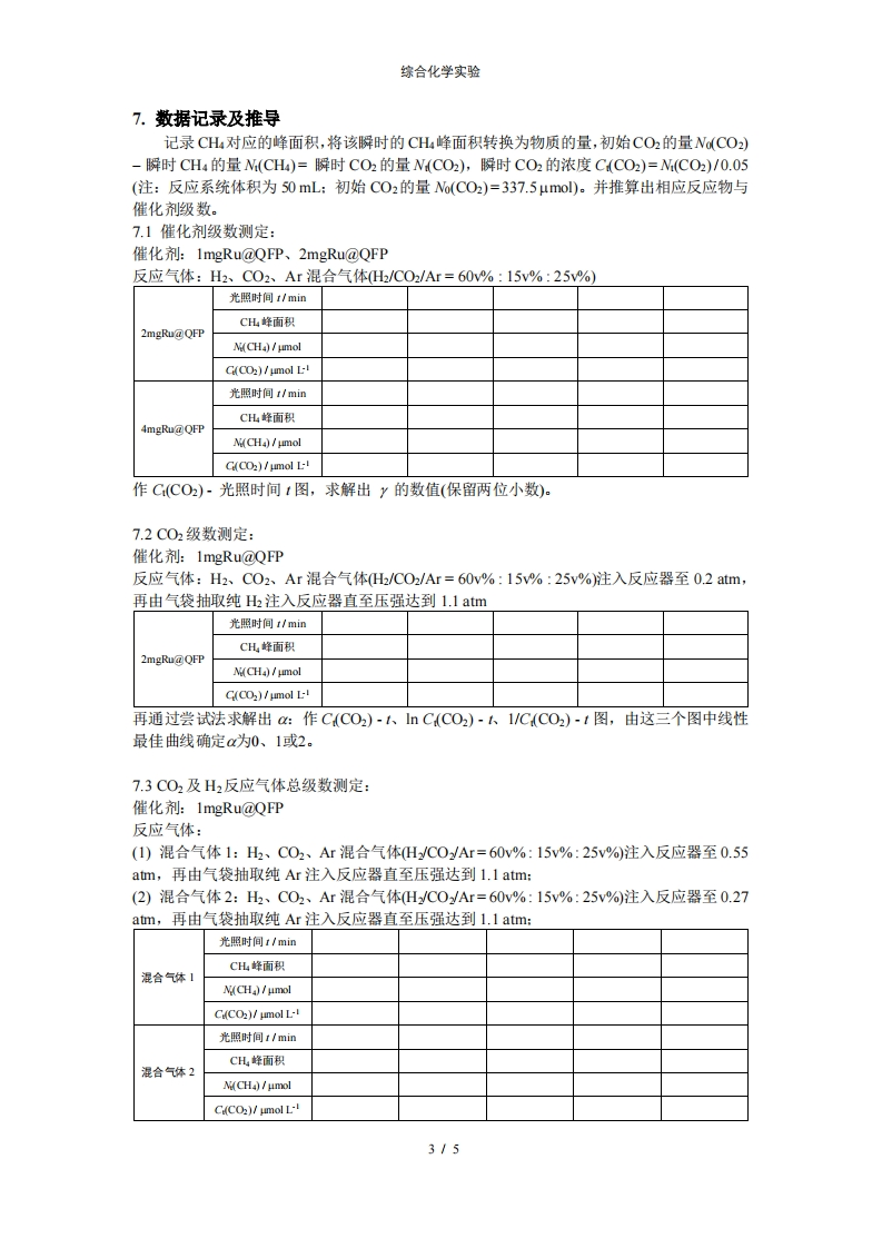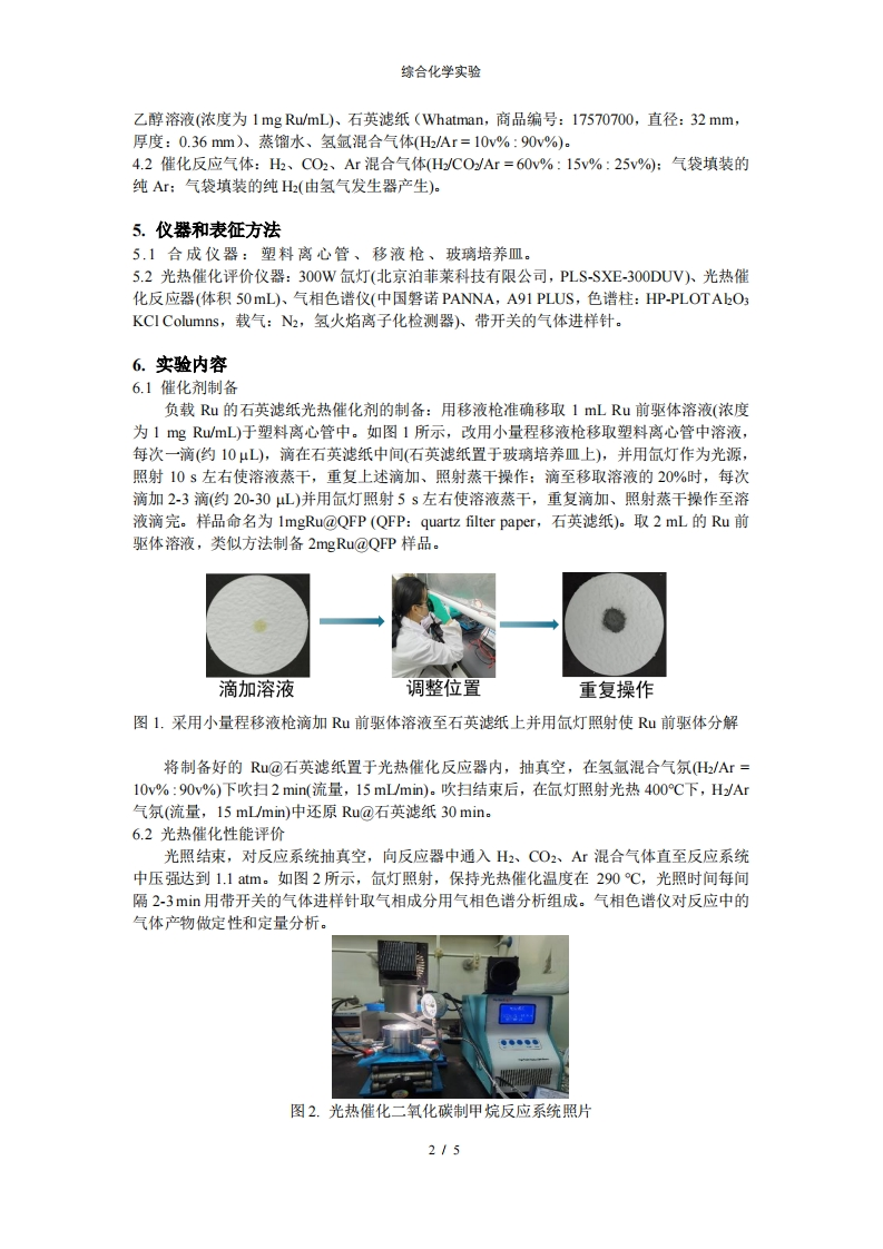 综合化学实验实验四钉-石英滤纸光热催化二氧化碳制甲烷1.研究背景及前沿20世纪以来,工业化大生产导致了石油、煤及天然气等传统化石能源的快速消耗并排放了大量二氧化碳(C0)。二氧化碳的过度排放导致全球气候变暖,引起生态系统严重失衡。如何降低大气中的C02浓度成为各国政府及科研工作者关注的焦点。2020年9月我国政府明确提出力争在2030年前实现“碳达峰”,2060年前实现“碳中和”目标。CO2加氢还原为甲烷(CO2甲烷化)是CO2资源化利用的途径之一,其不仅可以缓解温室效应,而且产生的甲烷可作为燃料,燃烧过程洁净安全,同时甲烷也是大量有机化学品的基础原料。传统热催化CO2甲烷化的能量往往来源于火电或是化石能源的燃烧,这导致了大量的碳排放。光热催化是催化剂(金属或窄带隙半导体材料)将光转化为热进而在表面诱导发生热催化反应的过程,整个反应的热量由光热催化剂的光热转化效应直接提供,而不消耗其它热量,具有实现低能耗及高效率突破的极大可能性,为利用丰富的太阳能实现CO2资源化利用开辟了一条新的途径。从热力学角度来看,高温(500℃以上)下甲烷化反应受热力学抑制:而从动力学角度来看,甲烷化反应需要将氧化态的碳原子完全还原,需要大量的活性氢参与反应。因此,选取中等温度(250~500℃)即可高效活化氢气()的催化剂至关重要。目前,C02甲烷化反应催化剂主要是VIⅢI族金属镍(Ni)、钴(Co)、铑(Rh)、钉(Ru)和钯(P)等催化剂,该族金属催化剂表现出较好的催化性能2.实验目的2.1学习光热催化原理和了解负载型催化剂和常见金属催化剂2.2学习了解测定气固多相催化反应反应级数和反应速率系数方法2.3体会设计实验方案过程,并学会设计合适的实验路线3.实验原理光热催化原理:太阳光照射金属纳米粒子,光的电磁波特性诱导金属的电子震荡撞击晶格,导致催化剂温度升高,达到合适温度时,金属催化氢气活化进而还原二氧化碳(CO2)。整个反应的热量由光热催化剂的光热转化效应直接提供,而不消耗其他热量。光热催化CO2甲烷化:C02+4H2→CH4+2H2O式(1)催化剂目前,CO2甲烷化反应催化剂主要是Ⅷ族金属镍(Ni)、钴(Co)、铑(Rh)、钉(Ru)和钯(P)等催化剂,该族金属催化剂表现出较好的催化性能。本实验项目选择对具有强活化能力的R如为活性组分,采用薄层、耐高温的石英滤纸为载体。根据式(1)写出经验速率方程如下:r=k*CO*H2]形*[催化式(2)根据学习过的复杂反应的实验设计及数据处理方法求解、B及y三个级数。4.试剂或材料4.1催化剂合成药品:RuC33H0(99%,华威锐科)、乙醇(AR,国药集团)、配制的RuC31/5