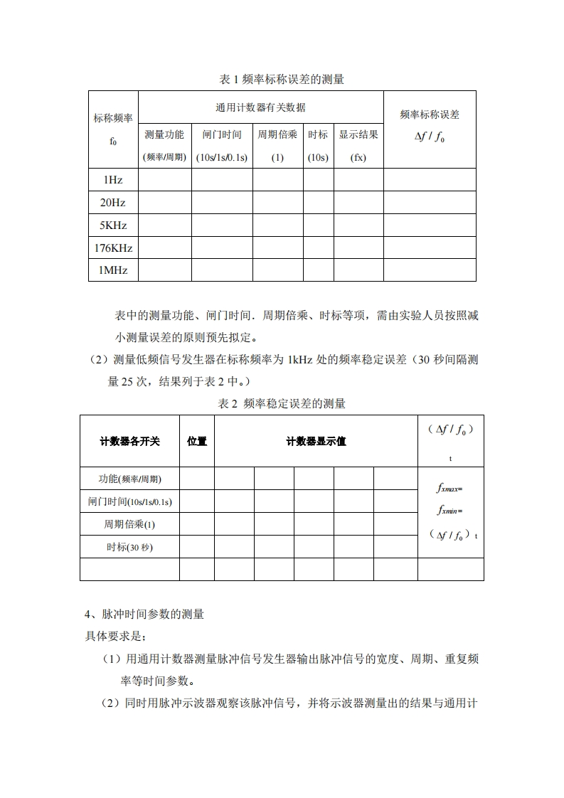 《电子测量》实验一频率的数字测量技术一、实验目的1、通过实验,进一步了解数字式频率计的工作原理。2、熟悉数字式频率计的正确操作。3、掌握减小测量误差及对测量误差进行分析的方法。二、实验内容1、利用通用计数器测量低频信号发生器的部分技术指标。2、利用通用计数器测量脉冲参数。3、利用通用计数器校准示波器的时基因数(或扫描速度)。三、预备知识1、通用计数器的原理及其基本功能及误差分析2、通用计数器测量各种参数的工作原理3、利用通用计数器测量信号发生器的频率技术指标频率标称误差的定义是:f=f-0×100%f fo一通用计数器测得值f0一信号发生器的频率标称值频率稳定误差的定义是(学=fnt一规定的时间间隔fmx选定的一组时间间隔内,计数器示值的最大值fm选定的一组时间间隔内,计数器示值的最小值