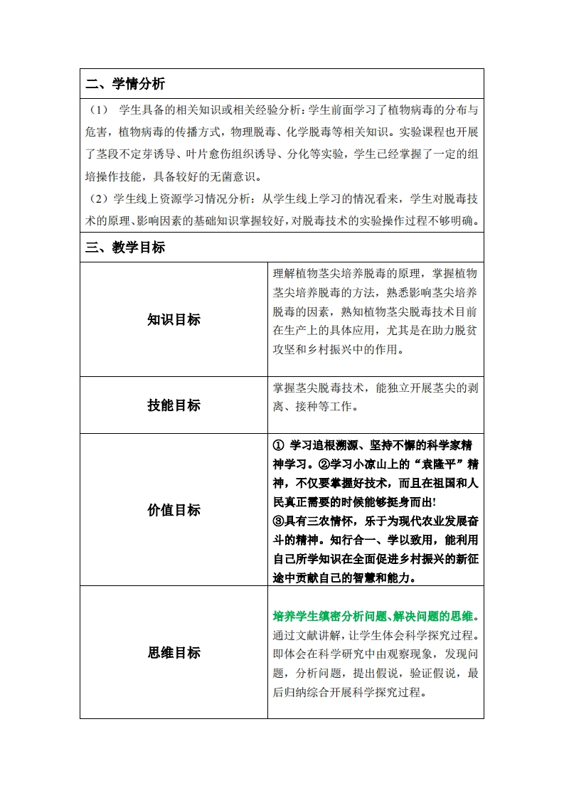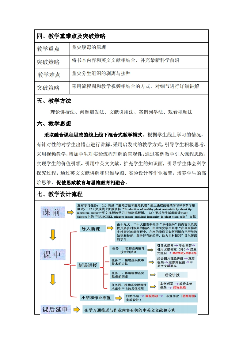 教学设计案例授课名称第七讲脱毒苗木培育(下)植物茎尖脱毒技术课程名称植物组织培养学时一、教学内容分析茎尖脱毒培养由于对植物病毒的脱除效果好,后代遗传性稳定,是目前应用最广、效果最为理想的方法,也是目前生产上最常用的脱毒措施,在花卉、水果、蔬菜等作物生产上得到了广泛应用。无性繁殖作物如草莓、丹参、魔芋、蓝莓、马铃薯等种植面积大、经济效益高,是扶贫和农业产业结构调整的主导作物,优质脱毒种苗的应用与推广对产业发展至关重要。茎尖脱毒技术在推进农业特色产业发展,助力脱贫攻坚和乡村振兴中发挥着重要作用。2017年习近平总书记在党的十九大报告首次提出“乡村振兴战略”,指出三农问题是关系国计民生的根本性问题,必须始终把解决好“三农”问题作为全党工作的重中之重,实施乡村振兴战略。二十大报告中习近平总书记提到“全面推进乡村振兴,坚持农业农村优先发展,巩固拓展脱贫攻坚成果,加快建设农业强国,扎实推动乡村产业、人才、文化、生态、组织振兴”。以习近平同志为核心的党中央,始终保持着对“三农”工作一以贯之的高度重视。我校积极响应党中央精准扶贫和乡村振兴号召,在学院党委的带领下,积极开展校企合作、校地合作,多措并举、聚焦帮扶村发展,共谋乡村振兴。因此,在该部分的教学过程中即要向学生讲述清楚茎尖脱毒的原理、方法等,更重要的是让学生意识到茎尖脱毒培养在脱贫攻坚和乡村振兴中的重要作用,引导学生具备“三农情怀”,树立能用所学知识和技能推进乡村振兴、发展乡村产业,为现代农业发展奋斗的观念。本次课的主要教学内容如下:(1)植物茎尖脱毒技术的原理:(2)植物茎尖脱毒技术的方法:(3)影响植物茎尖脱毒的因素:(4)植物茎尖脱毒技术在生产上的具体应用。