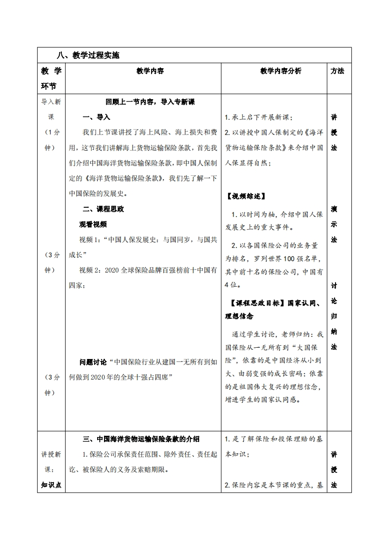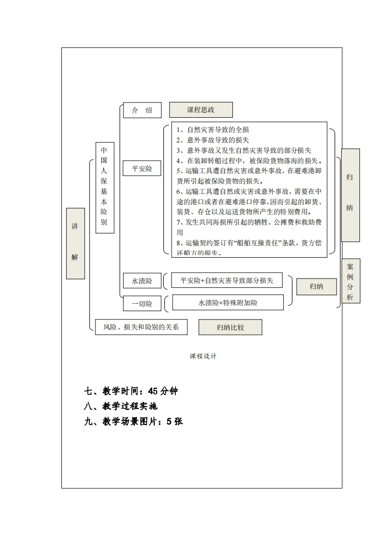 课程设计实施第八章第二节中国海洋货物运输保险条款一、学情分析口学生有从事国际物流就业意愿,课程在第五个学期开设,口本节内容是第八章第二节,学生已经完全掌握了海上风险、海上损失和费用。二、教学目标口通过视频展示中国人保发展史的视频,增强国家认同感、提升理想信念;口熟悉中国人保的基本险、水渍险和一切险的内容:口通过案例分析增进中国人保基本险的认知。三、教学方法直观演示法、讲授法、归纳总结法、案例分析法、比较教学法。四、教学重点口通过中国海洋货物运输保险条款的学习,了解中国人保的发展历程,增强国家认同感、提升理想信念:口平安险、水渍险和一切险的条款一条一条讲解,并进行归纳比较,让学生更好的记忆:五、教学难点口对平安险、水渍险和一切险进行分析,建立包含关系,☐对风险、损失和险别建立对应关系,通过表格进行归纳比较,加深理解。口通过案例,对中国人保的基本险进行分析,化解对其知识的理解。六、教学设计