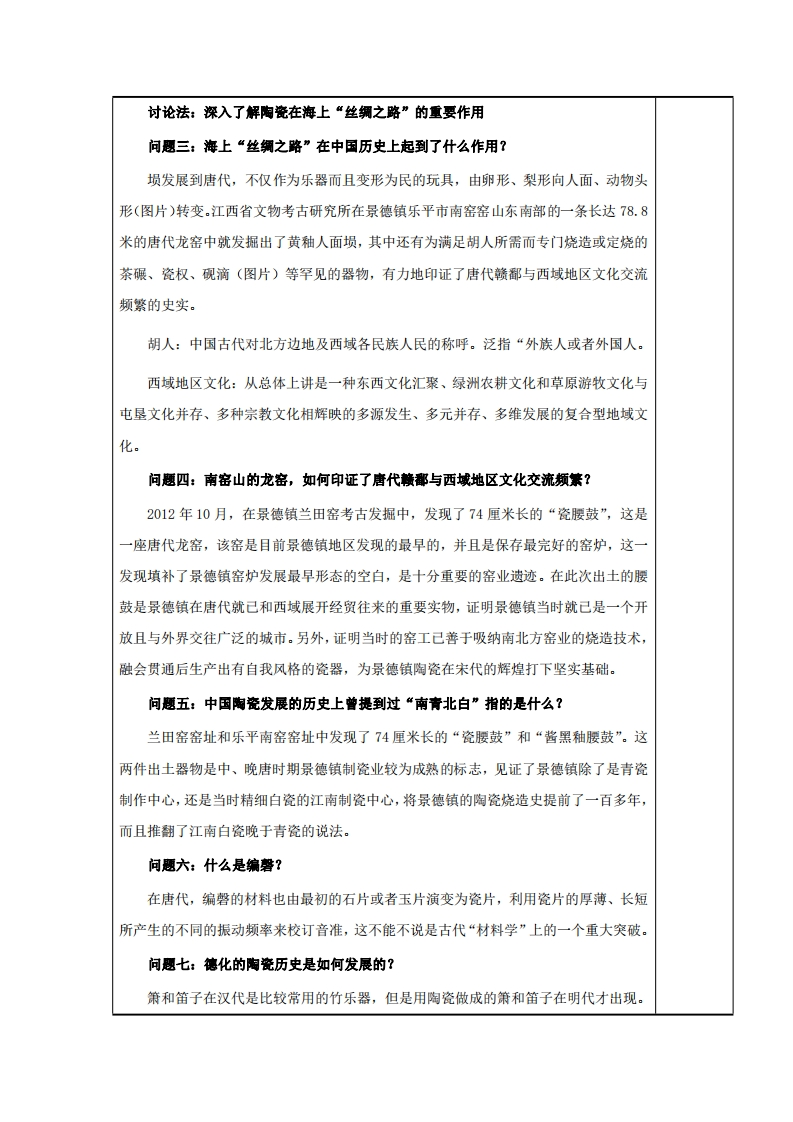 教学设计授课主题陶瓷乐器的历史沿革与发展相应章节第一章授课时间2022年9月16日第3周星期五第7.8节课时2授课类型理论教学☑实践教学☑地点瓷乐实训室(1)知识目标:了解不同历史时期陶瓷乐器的制作和发展。(2)能力目标:对于陶瓷乐器的历史发展阶段有清晰的认知。教学目的(3)情感目标:使学生深刻感受陶瓷音乐作为民族传统文化所蕴含的人文价与要求值,以及能成为世界优秀音乐文化的绚丽瑰宝的深刻内涵。(4)价值目标:通过学习,使学生能够更近一步的认识到中华民族传统音乐文化的博大精深,并怀着敬畏之心不断将其传承。思政元素:家国情怀、使命意识思政元素融入的通过对陶瓷乐器的历史学习,引导学生更近一步的了解中华民族优秀的传统文理念和思路化,拥有民族责任感和民族自豪感。教学重点1.远古时代的陶瓷乐器2.夏商周至秦汉时代的陶瓷乐器教学难点1.唐宋明清时代的陶瓷乐器2.近现代陶瓷乐器的继承与创新教学路径采用大班教学、小班研讨和学生独立学习相结合的方式,同时运用文献法、与方法探究法、追因法、提问法、讨论法探究陶瓷乐器历史发展教具仪器视频资料,PpT运用多媒体的教学手段,线上+线下的教学模式,教师现场解说与示范,构建多层敢学设计次、多模式、全方位的教学环境,创设具体生动的画面,打造课程思政的育人格局。教学过程一、导入新课:陶瓷,被世人称作“火与泥土的艺术”,暗示了它的神秘、它的质朴、它的刚烈。千百年来,陶瓷乐器作为陶瓷艺术与音乐完美结合的艺术形式,人们用“声如磬”来形容它的特殊音色,在我国古代陶瓷史和音乐史上,曾占有重要的一席之地,发挥过无可替代的作用。直到今天,它仍然在陶瓷艺术领域和音乐领域中散发着独特的魅力。教学备注二、新课内容:在陶瓷乐器概述中我们讲到:陶瓷乐器就其质地而言,分为陶、瓷两大类:就其演奏方式而言,又可分为哪几类?打击、吹奏、弹拨、拉弦四大类。请学生根据四种分类自行举例。