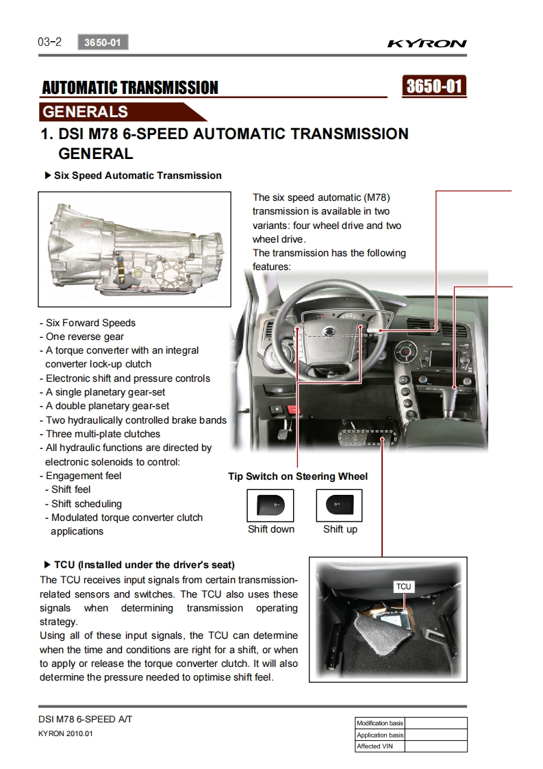 DSI M78 6-SPEED A/T3110-01/3650-01/3660-01/3680-01/3721-01/9210-01INDEXDSI M78 6-SPEED A/TGENERAL INFORMATION3650-01 DSI M78 6-SPEED A/T1.DSI M78 6-SPEED AUTOMATICASSEMBLY...793660-01 VALVE BODY..........TRANSMISSION GENERAL.......812.STRUCTURE CHARACTERISTICS AND3110-01TCU.83SPECIFICATIONS.…8443721-01 TGS LEVER…3.TIGHTENING TORQUE..............3650-01 INHIBITOR SWITCH..........8883110-01 TROUBLE CODE DIAGNOSIS.....92OVERVIEW AND OPERATIONDIAGNOSIS AND TESTINGPROCESS1.WIRING DIAGRAM.........941.GENERAL DESCRIPTION.........92.WIRE HARNESS CONNECTOR CHART.2.ADVANCED SIX SPEED FEATURES....95103.UNIT CONNECTOR DESCRIPTION........953.FUNCTION OF EACH MODE.............124.LIMP HOME MODE145.TRANSMISSION ELECTRONICTROUBLE CODE EIAGNOSISCONTROL SYSTEM.......151.DIAGNOSTIC TROUBLE CODE LIST.....996.CONFIGURATION OF CAN RELATED2.SYSTEM DIAGNOSIS...........101TO TCU197.POWER TRAIN....20MAINTENANCE OPERATIONSCONFIGURATION AND FUNCTIONS1.OIL TEST…1442.STALL TEST......1463721-01 TGS LEVER.473.TRANSMISSION RESET PROCEDURE3680-01 DSI M78 6-SPEED A/T(REPLACEMENT TRANSMISSION).......147ASSEMBLY.…584.FLUID LEVEL INSPECTION..............1483680-01 VALVE BODY.695.TRANSMISSION COOLER AND3110-01TCU.73HYDRAULIC LINE FLUSHING3650-01 INHIBITOR SWTCH..........76PROCEDURE1496.LUBRICATION........149REMOVAL AND INSTALLATION7.TRANSMISSION COOLER AND9210-01 FLUID LEVEL INSPECTION......77HYDRAULIC LINE FLUSHING3650-01 TRANSMISSION RESETPROCEDURE(NEW TRANSMISSION)...150PROCEDURE (REPLACEMENTTRANSMISSION).78