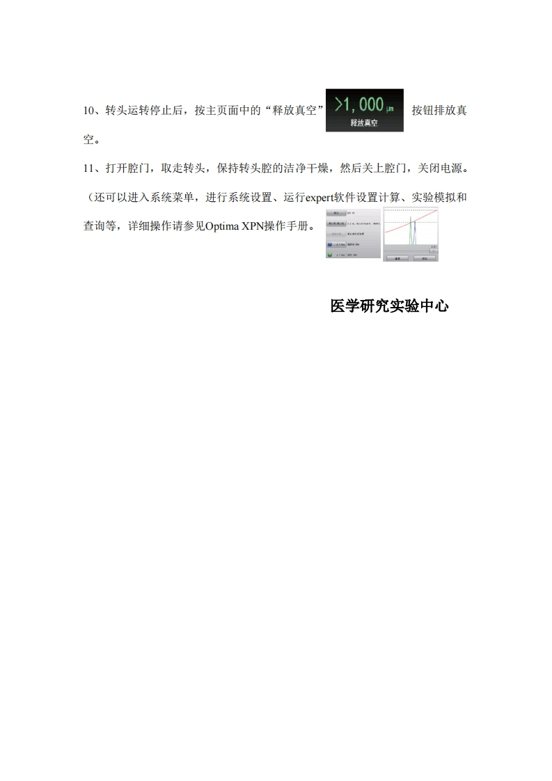 Optima XPN-100超速离心机简明操作规程操作步骤:1、打开侧面电源打开腔门,准确安装转头,关上腔门。2、在触摸屏主页面中001点击转速按钮进入转速页面输入要求的转速,若有需要请选择转头。0200003、在主页面中点击时间0:01按钮,输入要求的时间(时间最高设置设晋时间:0:01h:m为999小时59分,或使用锁定/Hold模式)4、在主页面中,点击温度0按钮,输入要求的温度(0-40℃)。设置温度:25°05、在主页面中,选择加/减速42按钮,输入相应的加速速率和加函减速减速速率。6、在输入所有要求参数后,再次检查样品、离心管、转头等安装无误后,按下“开始”按钮,仪器即开始按设定的程序运行。开始7、若有需要,点击主页面中的“实时运行曲线图”按钮查看仪器的实时运行状态。9、若需要设定程序,点击主页面中的“程序”按钮创建所需程序。