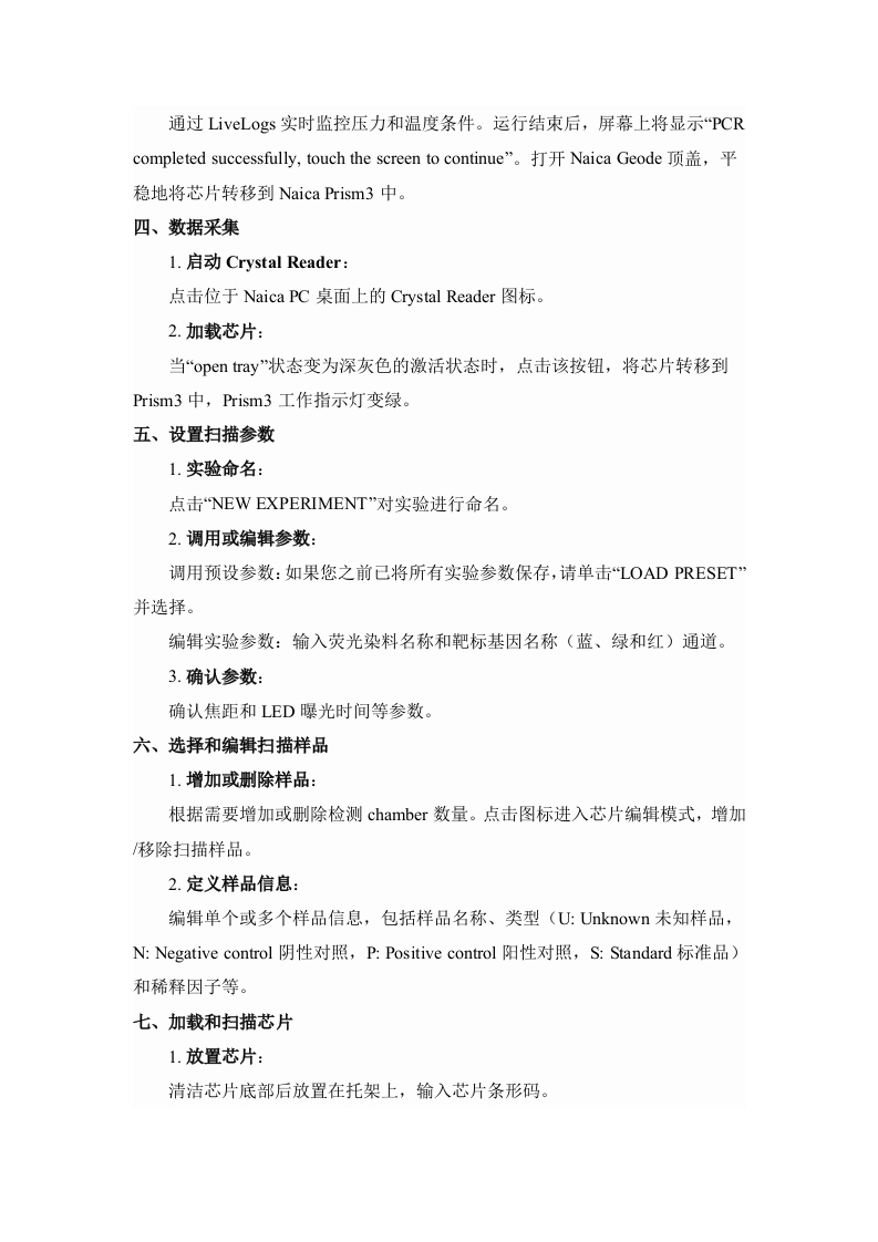 Stilla naica®数字PCR系统操作流程一、实验准备1.使用配套的微流控芯片如Sapphire芯片,支持1-12样本/次;或Opal芯片,支持148样本/次。2.准备PCR反应预混液(含引物、探针、酶、NTPs等),需根据实验设计优化浓度(如引物/探针浓度建议0.125-1M)。3.混合与离心:将上述试剂加入到离心管中。涡旋混匀后瞬时离心,将所有试剂离心到管底。二、加样1.打开芯片:打开Sapphire芯片的白色盖子,任意方向旋转l4圈即可打开,丢弃盖子。2.加样操作:移取25uL混合好的PCR反应液,加入到Sapphire芯片的孔井中,注意不要与内置油相接触。3.封闭芯片:使用专用PCR盖封闭孔井。4.芯片转移:将封闭好的芯片转移到Naica Geode微滴生成和扩增系统中。三、微滴生成和PCR扩增1.系统准备:打开Naica Geode系统,调节气压到1,250+/-50mbar。2.芯片放置:打开机器盖,将芯片垂直放置于加热模块上,关闭机器盖并确保密封。3.程序选择与启动在主幕菜单中选择Run”,然后Open”,在“scripts'”或templates'”下拉菜单中选择应用程序点击Open”(默认的PCR和RT-PCR程序在“templates''中)。也可以编辑程序参数后启动。4.监控与结束: