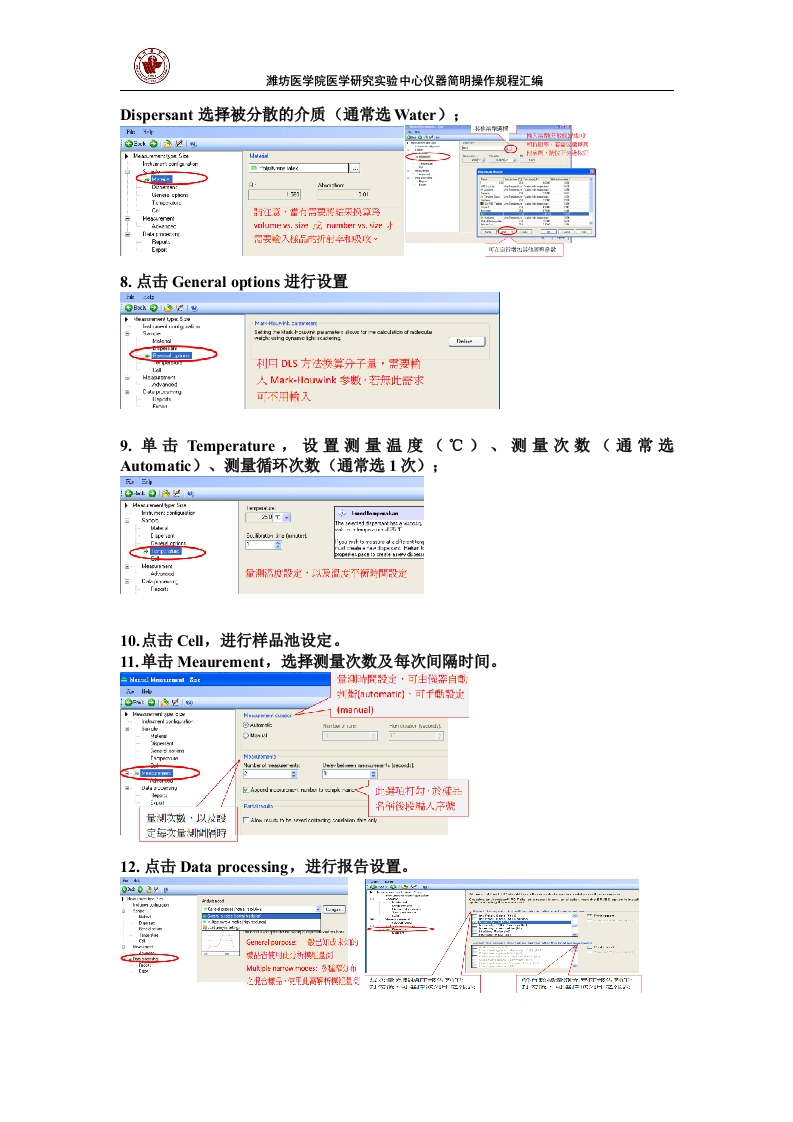 潍坊医学院医学研究实验中心仪器简明操作规程汇编Zetasizer Nano ZS90纳米粒径电位分析仪简明操作规程1.开启电源:等待30min以稳定激光光源。2.开启电脑,双击,等待仪器自检(指示灯变为绿色即自检成功)。3.新建测定程序iEl Eclt 2w Maagune Toos Serurity ind:HEp团☒tMerusent Hs.Ctl包0IF◆Q3¥1epgCh=a产河率Me ruaerl Deand Ii0ax=4:Eamt.…07平1月日上午03516250g2军18明上千101:1伦51Di.Sc.up.20年1月8日卜午10.0309250Pric Previen20平1月8日上午113x34502007年1900上T11:4:450BTChleE201年1月日上年11327250解入言散内控名·安存Betcn pr nt.nLd..件1月H下伞.gCrEate pormLe20W军1日90下年04:125050所5071阳T无042550uMI☒4.单击工作栏上的Mesurement→Manual-→MeaurementEle Edit viawMeasure TodsSecurty Wirdow Heb0039dMarual·子3阳Records vewotbe..volume PSD (M)YOsce quaity eportRecord Type Samole NSOP Playerto and T me T 2Ave Pcl Pk 1 Noan Intdm■d.nmRecant sOP5.单击Meaurement Type→选择Size6.单击Sample,输入测量样品名弘p阳江33物Mess/smerlloxSoe上tc0)acr%ample ronsBsmo:机…静人株品名伦收街定Lel日kueAdrancsdCota procesigF>pnt7.单击Material选择Material Name(如为脂质体,请选择Liposome)/单击