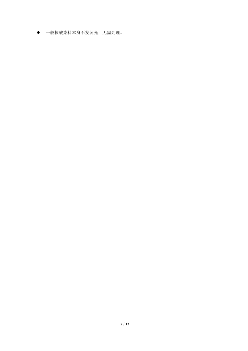 单颗粒纳米生物检测仪简明操作规程样品检测前准备:为了更好地实现样品检测,我们建议您在开机后准备样品的同时,准备下列物品:√150μL洗液和150 uL ddH20若干管,用于样品检测管路清洗和毛细管头清洁:√以下样品均用0.6mLEp管准备,实际样品体积不超过100L。●Sl6M-Exo(Silica Nanospheres Cocktail68-l55nm,I00 times dilution)用于EVs检测,如外泌体及其他折射率相近的纳米粒子●Counting standard beads(250 nm SiNPs,I00 times dilution)作为浓度标准品用于浓度定量。样品检测步骤(以外泌体检测为例)一、浓度标准品检测1.上样:Load浓度标准品(250 nm SiNPs,100μL),Sample-一一Boosting,时间1min。2.参数设置:在Samp.Inf中选择“250 nm Std FL SNPs”,默认参数为Laser power.20mW,SS Decay:0.2%。同时,输入稀释倍数100。样品名称可手动修改。3采样:Sample一一-Samping,点击工具栏图并选择Large signal,自动设置阀值:点击Auto Sampling并在Sampling SET右侧框中输入l.0,固定Sampling压力为l.0kPa:等待Sampling压力稳定在l.0kPa后,点击Time to Record采集数据:数据采集完成后采集模式自动跳到Buffer,点击弹框中的Save按钮,保存数据为Nfa File;将样品Unload。4.毛细管清洗:Load洗液(150μL),Sample-一一Boosting时间1min,Unload。用超纯水(150μL)清除毛细管头残留的洗液。二、粒径标准品检测1.上样:Load粒径标准品(Silica Nanospheres68-155m,l00μL),SampleBoosting,时间1min.2.参数设置:在Samp.Inf中选择“68-155S16M-Ex0”。样品名称可手动修改。3.采样:Sample Sampling,点击工具栏图并选择Small signal,自动设置阀值:固定Sampling压力l.0kPa:点击Time to Record采集数据:点击弹框中的Save按钮,保存数据为Nfa File:将样品Unload。4.毛细管清洗:Load洗液(l50μL),Sample一一Boosting时间1min,Unload。用超纯水(150μL)清除毛细管头残留的洗液。三、空白对照检测:参照步骤二。四、样品检测:参照步骤二。浓度检测·稀释浓度标准品和样品使检测粒子数在4000-8000 particles/min(最佳范围),最高颗粒数不要超过12000 particles/min。250 nm SiNPs浓度标准品建议稀释100倍粒径检测粒径标准品、空白对照和待测样品均需要在相同激光功率和散射通道衰减系数下采样●若待测样品粒径偏小,需要提高激光功率,则68-155m粒径标准品和空白对照也在修改后的条件下进行检测荧光样品检测(去除游离的染料分子*)1.确认选用的荧光染料的激发光谱和发射光谱与仪器相匹配。2.根据“检测条件设置”设定初始检测条件,再根据各个通道的信号强度调整激光检测参数使荧光通道的信号能与背景良好区分,且散射通道的信号不饱和,即提高激光功率,增大散射通道信号衰减倍数3.去除游离的染料或优化抗体标记量●免疫荧光染色时,请确认游离的抗体已被除去或者优化抗体标记量使荧光背景水平降低到合适的水平:●做磷脂染色时,要注意磷脂分子自身团聚的问题:1/13