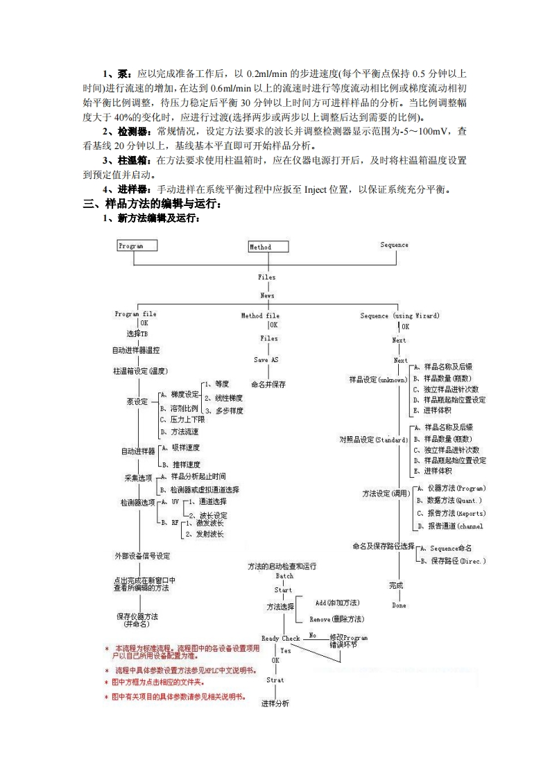 戴安HPLC标准操作规程(SOP)一、准备工作1、泵:A、流动相:①、流动相是否充足:(主要是有机相或者是单一通道的缓冲盐体系),一般应在所预计的消耗量之上加150ml,以保证仪器运行过程中不会出现流动相短缺:②、流动相是否新鲜:(主要是高纯水及缓冲盐流动相),一般情况下一次制得的纯水或缓冲盐流动相应在连续的24小时内使用完,如未使用完也应弃去不用,并重新配制新鲜的流动相。特殊情况至少应重新过滤并脱气。B、柱塞清洗液:清洗液是否新鲜及匹配:对于常规的流动相(一般指不含盐或离子对等添加剂的流动相),配制50%甲醇作为清洗液,在连续不超过4天工作的情况下可以两周一换:若超过4天,则一周一换。对于含盐或其它添加剂的流动相,配制5%甲醇(或高纯水)作为清洗液,在连续使用时,应每日更换:中间如有较长时间不用,则应改为50%甲醇作为保存液,并在下次使用时,根据所使用的流动相配制适宜的清洗液。:若泵超过半个月以上不用,应将柱塞清洗溶剂管(蠕动泵下压部分)抽出,再下次使用时放回原位置,以保证清洗管道的正常使用。C、溶剂管道:①、管道中的气泡:在泵长期不用时,由于脱气机停止工作,流动相会重新溶剂环境中的气体,而产生的气泡会对柱、泵及检测器产生不同程度的影响,因此要求在停泵后重新使用时应先观察A、B、C、D四溶剂管道进比例阀部分是否存在气泡,如无,在泵启动后等待5分钟后(脱气机自动脱气),再启动泵流速:若有,则选择相应的通道(按泵面板上的相应字母并保持约3秒钟),打开PURGE阀后,按面板上的PRGE键进行流动相自动脱气(可选择再次按键关闭,或等待5分钟后仪器自动停止),完成后先关闭PURGE阀,再启动泵流速。②、流动相快速替换:由于流动相通道有限,当在同一个通道中更换流动相时,应首先打开PURGE阀,再按泵面板上的PURGE键进行快速溶剂替换(流动为6ml/min,持续5分钟),完成后再关闭PURGE阀,按要求进行系统的过渡或平衡。2、自动进样器:A、进样针排气:当自动进样器非连续使用时(间隔一天或以上)应在仪器启动前(尤其是泵)先进行进样针排气。打开Chromeleon主程序后,点出Files,选择Browser,打开后,点击Dionex Temp.,选择Panle中的Dionex LC,在右边的窗口中双击ASI100.pan文件打开后,点菜单Control拉至最低下点击,在Connect变绿后,选手Wash,settings更改Wash Volue为250、Dispense为50后,在R、B盘中放置甲醇,G盘中放置异丙醇,按Prie进行针排气,完成后即可。(对于面板中有设置的用户直接在自动进样器设置窗口中按针排气(Syringe Prime)即可。B、进样针清洗:当连续使用中需要更换样品类型或流动相粘度较大时,应在每次进样完成后进行针清洗。在Program编辑查看时,在结束时间命令前加WASH命令:如选择单瓶进样,则在进样完成后,按自动进样器选项中的Wsh键进行清洗。3、柱温箱:柱温箱应在打开电源且柱连接好后,及时设置为方法要求的温度。4、检测器:为减少灯能量浪费,检测器应在样品准备完成后或基本完成时,且仪器系统按要求流动相及流速平衡至少30分钟以上后打开,在完成自检20分钟以后方可开始样品的分析。二、仪器平衡:
