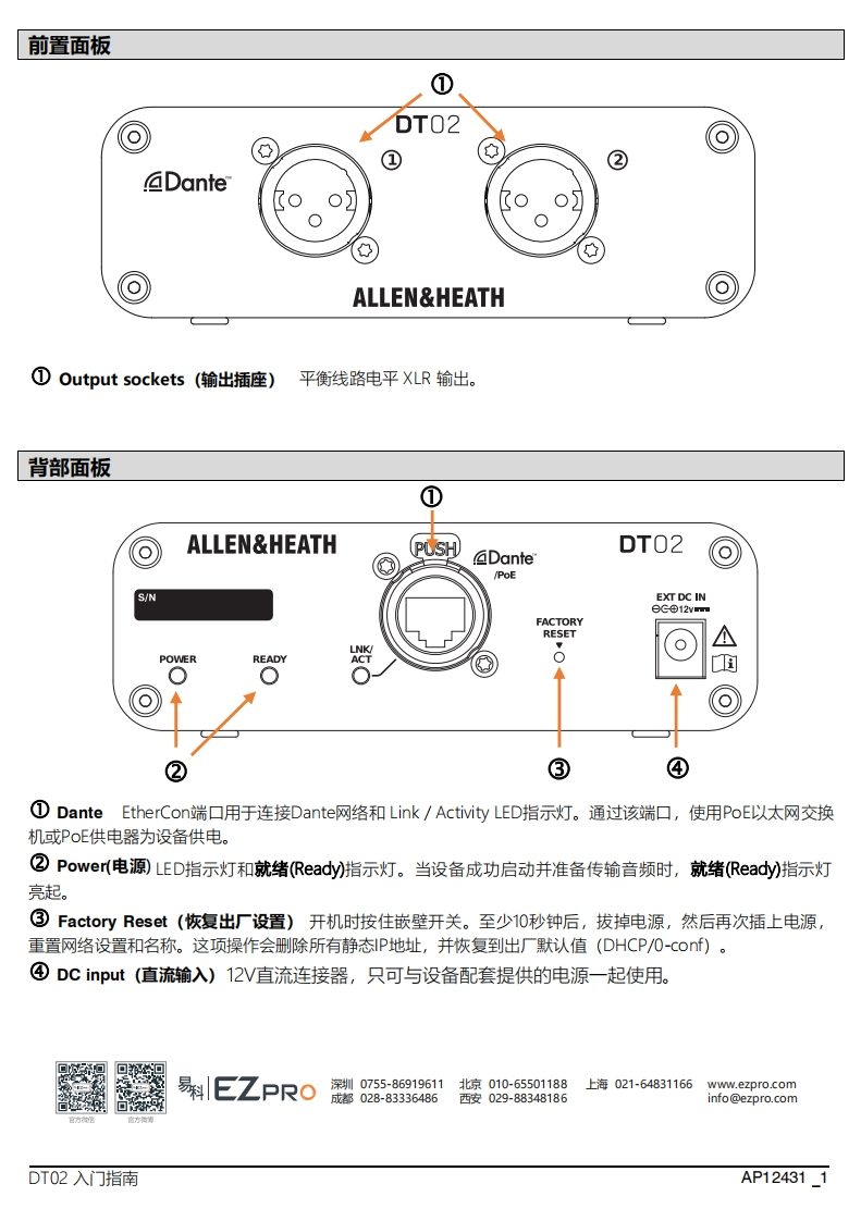 DT02表面安装DT02是一款坚固耐用的便携式Dante I/O单元,支持通过表面安装耳片,可以将设备安装在平面、桌面PoE,可以用来补充Allen&Heath数字混音系统或和讲台的顶部或下方,也可垂直安装在墙壁或隔板Dante网络上的其他系统。DTO2通过一对XLR连接器上。安装时耳片可以面向设备的顶部,也可以面向提供2个平衡线路电平输出,经由一根Cat网线连接设备的底部。到Dantel网络。DT02-M配有表面安装耳片和预置的插杆。将DT02有两个版本可供选择耳片放置在设备两侧的中心位置,与插杆上的螺纹孔对齐,可根据需要朝上或朝下放置,并DT02标准版,配有橡胶垫和12V电源。使用包装中提供的4个M3x6mm螺丝将其固DT02-M版,用于固定安装,配有表面定。安装支架,无外部电源。标准版DTO2表面安装时,可以选择DT-SMK表面安装套件。软件请访问Audinate网站了解更多关于Dante的信息,并下载Dante控制器从而在Dante网络上传输音频和配置设备:https:/ww.audinate.com/烟®酒a规格参数机架式安装XLR输出平衡,继电器保护输出阻抗<752使用可选的DT-RK19机架套件,在1U的机架空间内最标称输出+4dBu=0dB计器读数多可以安装2台DT02。最大输出电平+22dBuDante48kHz/96KHz功率和温度直流输入+12VDC1.25ARegister your product with Allen Heath online at:功耗10W最大值http://www.allen-heath.com/support/register-product/操作温度范围0°C至40°C(32℉至104F)PoE要求802.3af15W尺寸和重量宽X深X高X重量ALLEN&HEATHDT02130×131×43mm,0.5kgCopyright2020 Allen Heath.All rights reserved.(5.1"x5.2"×1.7",1lbs)DT02入门指南AP12431_1