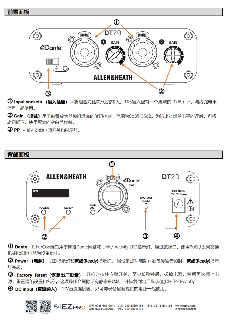 DT20表面安装DT20是一款坚固耐用的便携式Dante/O单元,支持通过表面安装耳片,可以将设备安装在平面、桌面PoE,可以用来补充Alen&Heath数字混音系统或和讲台的顶部或下方,也可垂直安装在墙壁或隔板Dante网络上的其他系统。DT20提供2个带本地增益上。安装时耳片可以面向设备的顶部,也可以面向和幻象电源控制的话筒/线路前置放大器,经由一根设备的底部。Cat网线连接到Dantel网络。DT20有两个版本可供选择DT20-M配有表面安装耳片和预置的插杆。将耳片放置在设备两侧的中心位置,与插杆上的DT20标准版,配有橡胶垫和12V电源。螺纹孔对齐,可根据需要朝上或朝下放置,并DT20-M版,用于固定安装,配有表面安使用包装中提供的4个M3x6mm螺丝将其固装支架,无外部电源。定。标准版DT20表面安装时,可以选择DT-SMK表面安装套件。软件请访问Audinate网站了解更多关于Dante的信息,并下载Dante控制器从而在Dante网络上传输音频和配置设备:https://www.audinate.coml烟®授a。规格参数机架式安装话筒/线路输入话筒输入平衡XLR,+48V幻象使用可选的DT-RK19机架套件,在1U的机架空间内模拟增益0至+55dB最多可以安装2台D20。线路输入平衡TRS,-20 dB PAD最大输入电平+3OdBu(包含TRS)输入增益>4k2(XLR),>10k2(TRS)Dante48kHz/96kHz功率和Register your product with Allen Heath online at:温度http://www.allen-heath.com/support/register-product/直流输入+12V直流125A功耗10W最大值操作温度范围0°C至40°C(32°F至104°日PoE要求802.3af15W尺寸和重量宽X深X高X重量ALLEN&HEATHCopyright 2020 Allen Heath.All rights reserved.DT20130×136×43mm,0.5kg(5.1×5.4"x1.7",1lbs)DT20入门指南AP12432_1